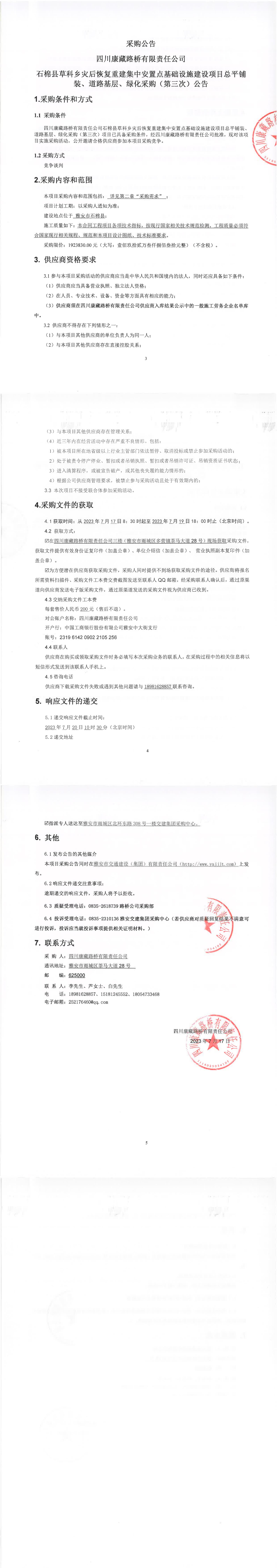 四川康藏路橋有限責(zé)任公司石棉縣草科鄉(xiāng)災(zāi)后恢復(fù)重建集中安置點(diǎn)基礎(chǔ)設(shè)施建設(shè)項(xiàng)目總平鋪裝、道路基層、綠化采購(第三次)公告
