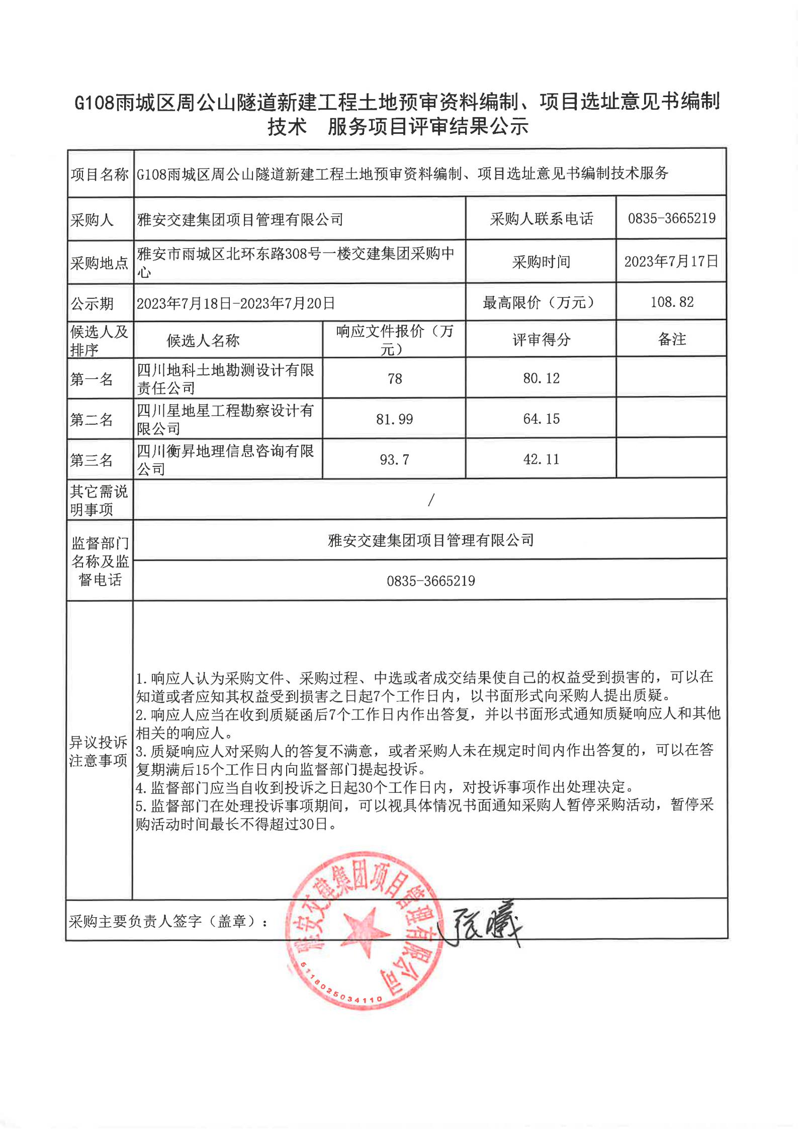 雅安交建集團(tuán)項(xiàng)目管理有限公司G108雨城區(qū)周公山隧道新建工程土地預(yù)審資料編制、項(xiàng)目選址意見(jiàn)書(shū)編制技術(shù)服務(wù)項(xiàng)目評(píng)審結(jié)果公示