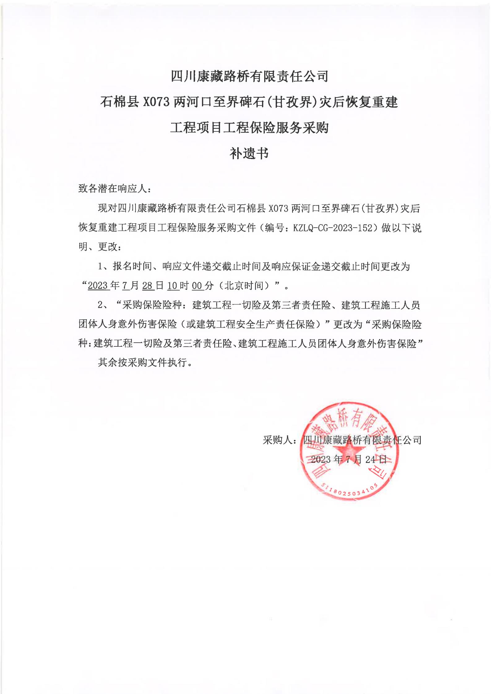 四川康藏路橋有限責任公司石棉縣X073兩河口至界碑石(甘孜界)災后恢復重建工程項目工程保險服務(wù)采購補遺書