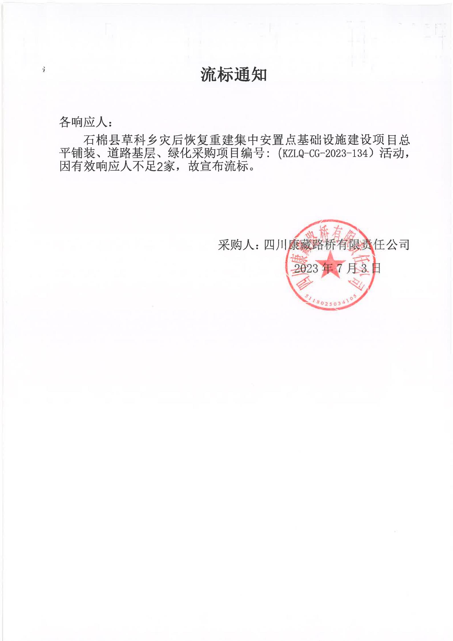 四川康藏路橋有限責(zé)任公司石棉縣草科鄉(xiāng)災(zāi)后恢復(fù)重建集中安置點(diǎn)基礎(chǔ)設(shè)施建設(shè)項(xiàng)目總平鋪裝、道路基層、綠化采購(gòu)流標(biāo)通知