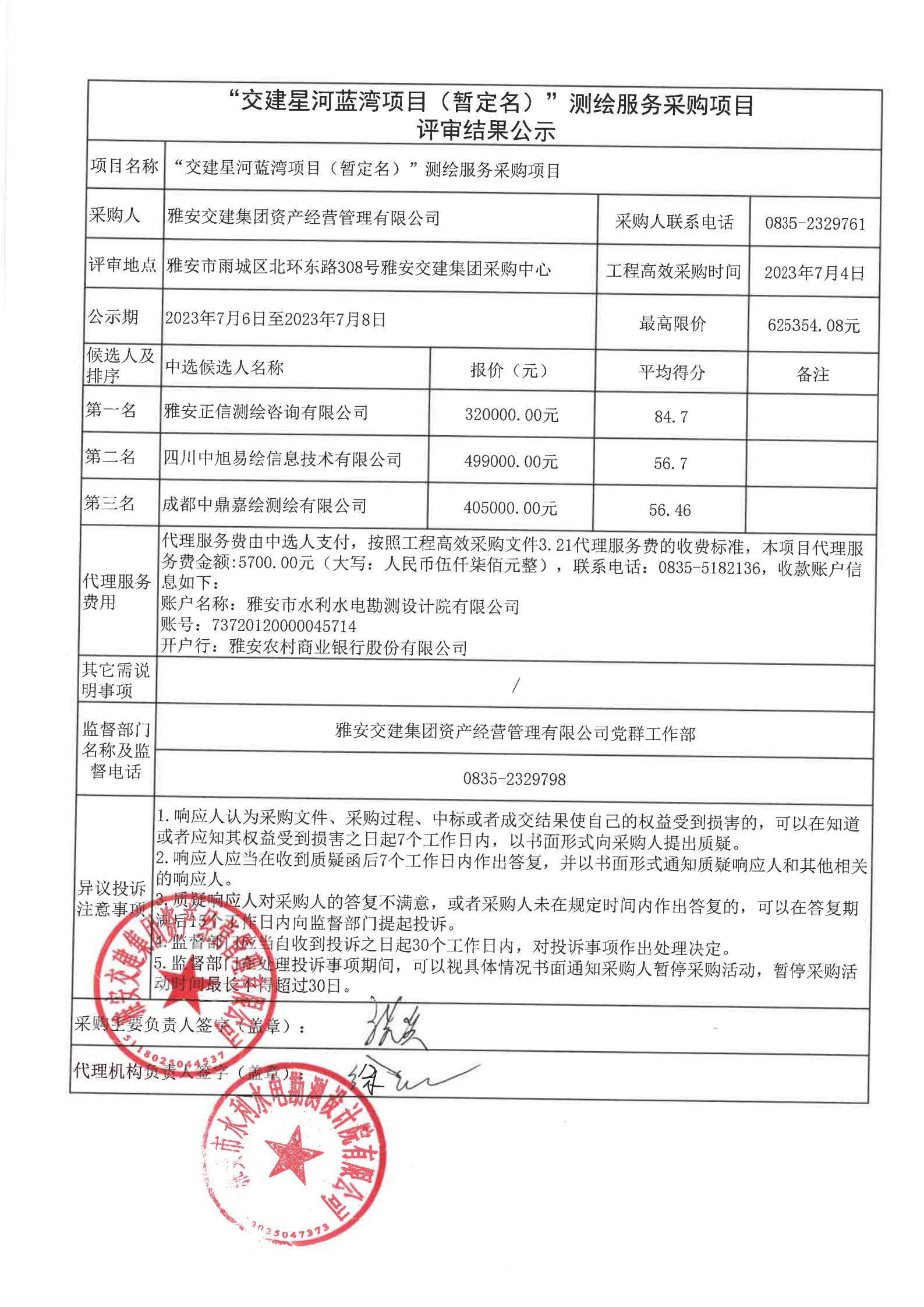 雅安交建集團(tuán)資產(chǎn)經(jīng)營管理有限公司“交建星河藍(lán)灣項(xiàng)目(暫定名)”測繪服務(wù)采購項(xiàng)目評審結(jié)果公示