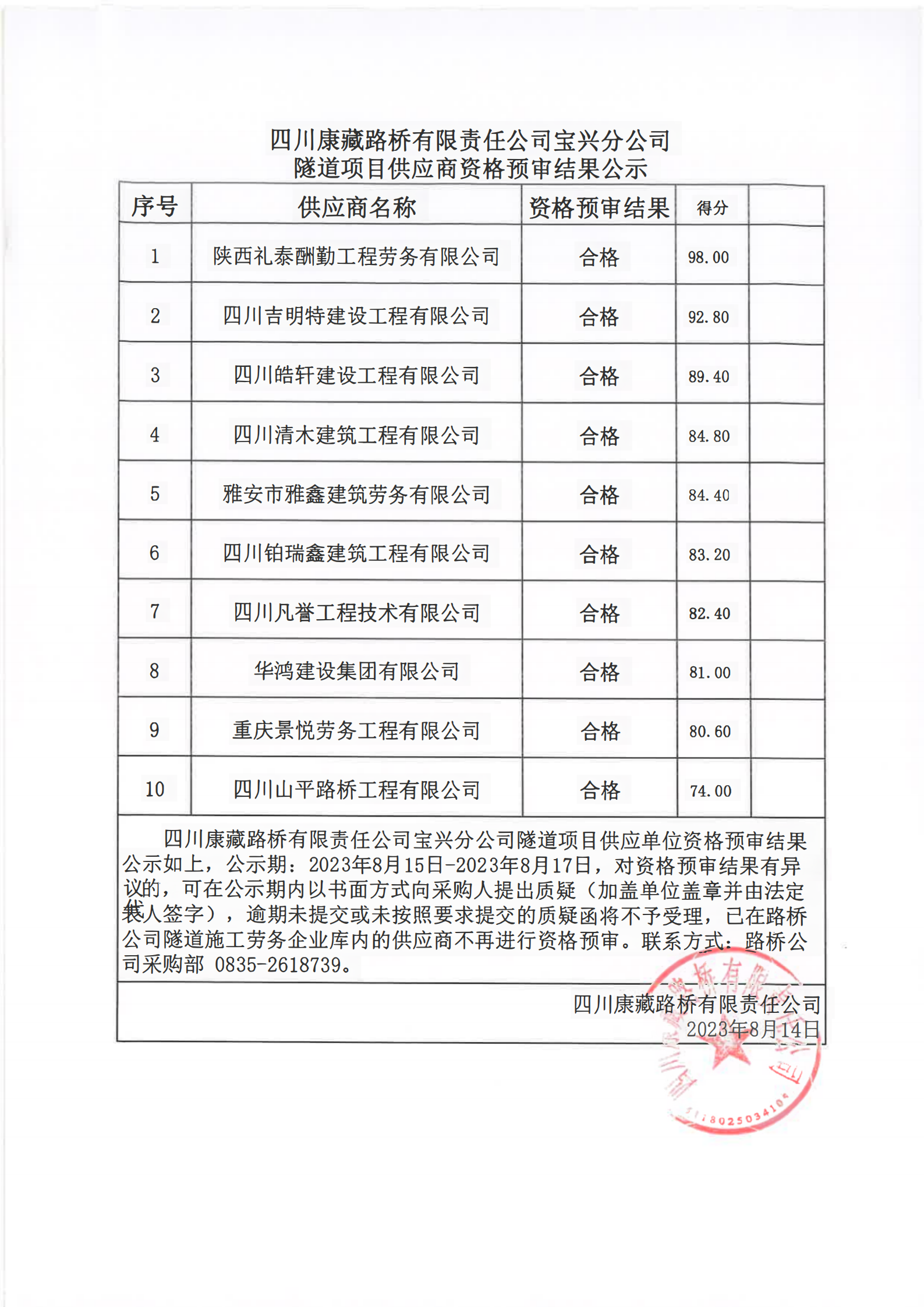 四川康藏路橋有限責任公司寶興分公司隧道項目供應商資格預審結果公示