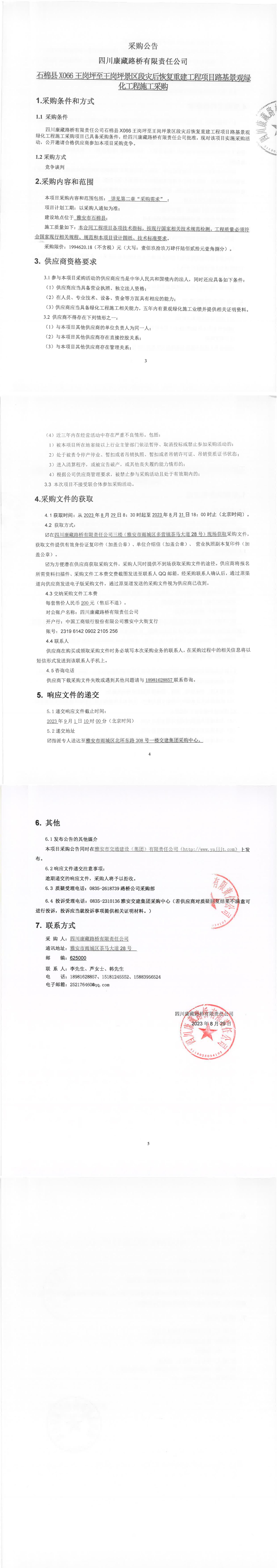 四川康藏路橋有限責任公司石棉縣X066王崗坪至王崗坪景區(qū)段災后恢復重建工程項目路基景觀綠化工程施工采購公告