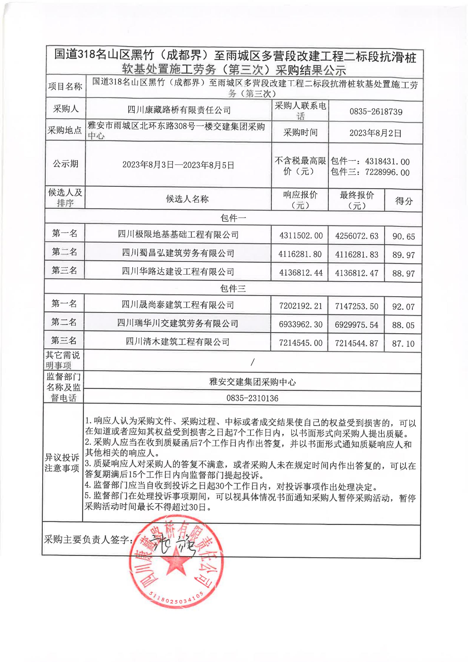四川康藏路橋有限責(zé)任公司國(guó)道318名山區(qū)黑竹(成都界)至雨城區(qū)多營(yíng)段改建工程二標(biāo)段抗滑樁軟基處置施工勞務(wù)(第三次)采購(gòu)結(jié)果公示