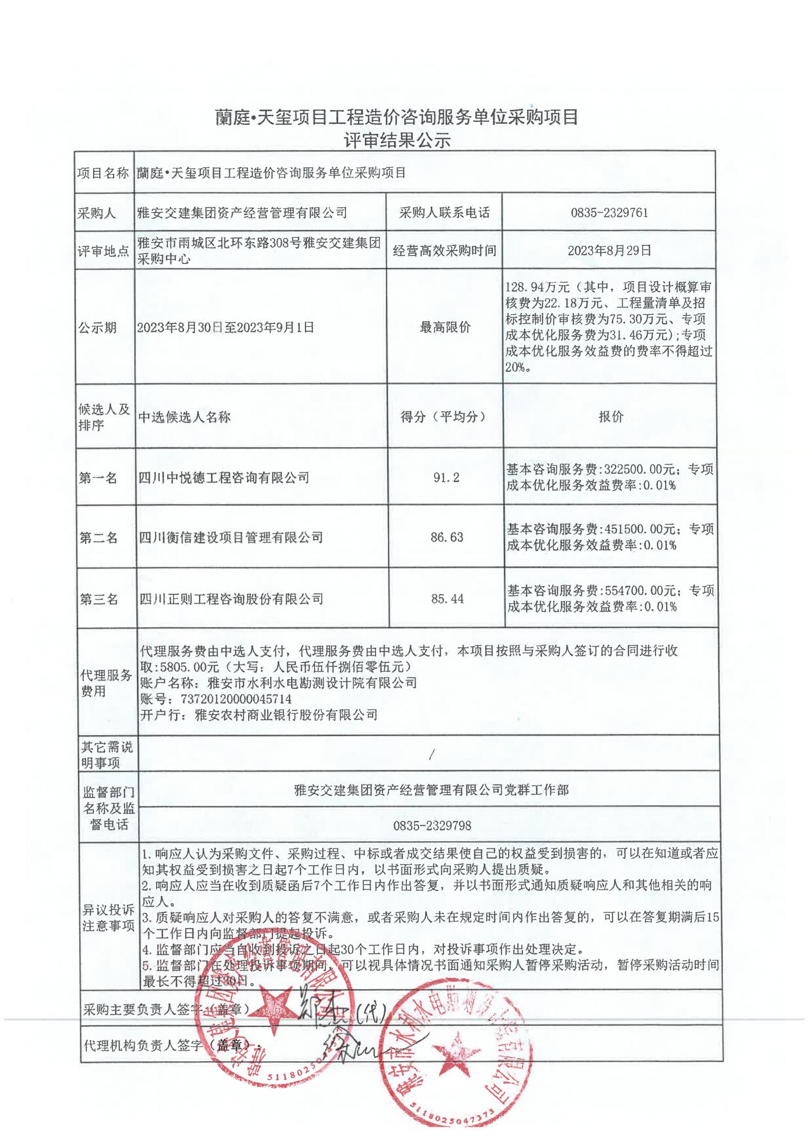 雅安交建集團(tuán)資產(chǎn)經(jīng)營管理有限公司蘭庭·天璽項目工程造價咨詢服務(wù)單位采購項目評審結(jié)果公示