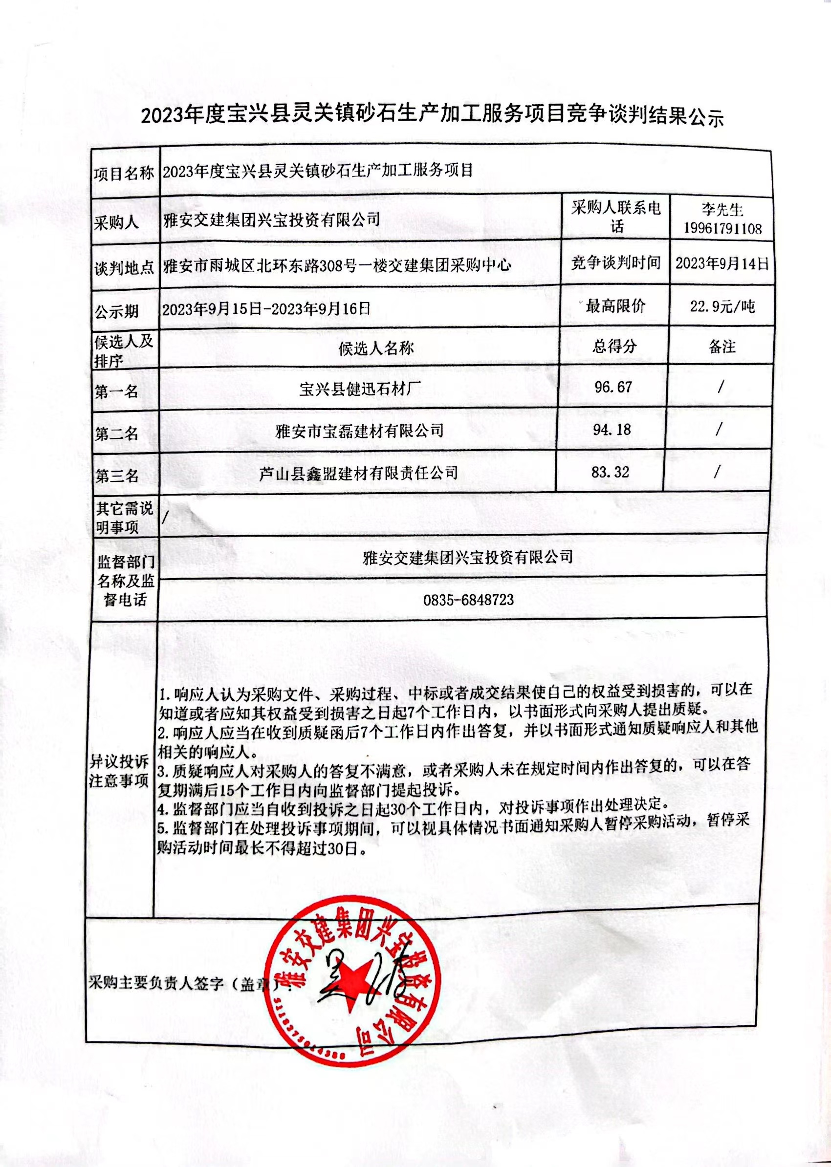 雅安交建集團興寶投資有限公司2023年度寶興縣靈關鎮(zhèn)砂石生產(chǎn)加工服務項目競爭談判結果公示