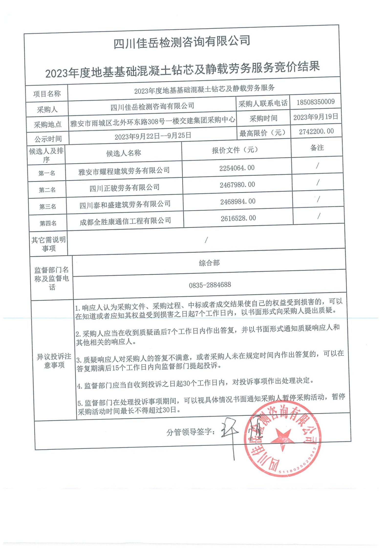 四川佳岳檢測咨詢有限公司2023年度地基基礎混凝土鉆芯及靜載勞務庫內(nèi)競價結果