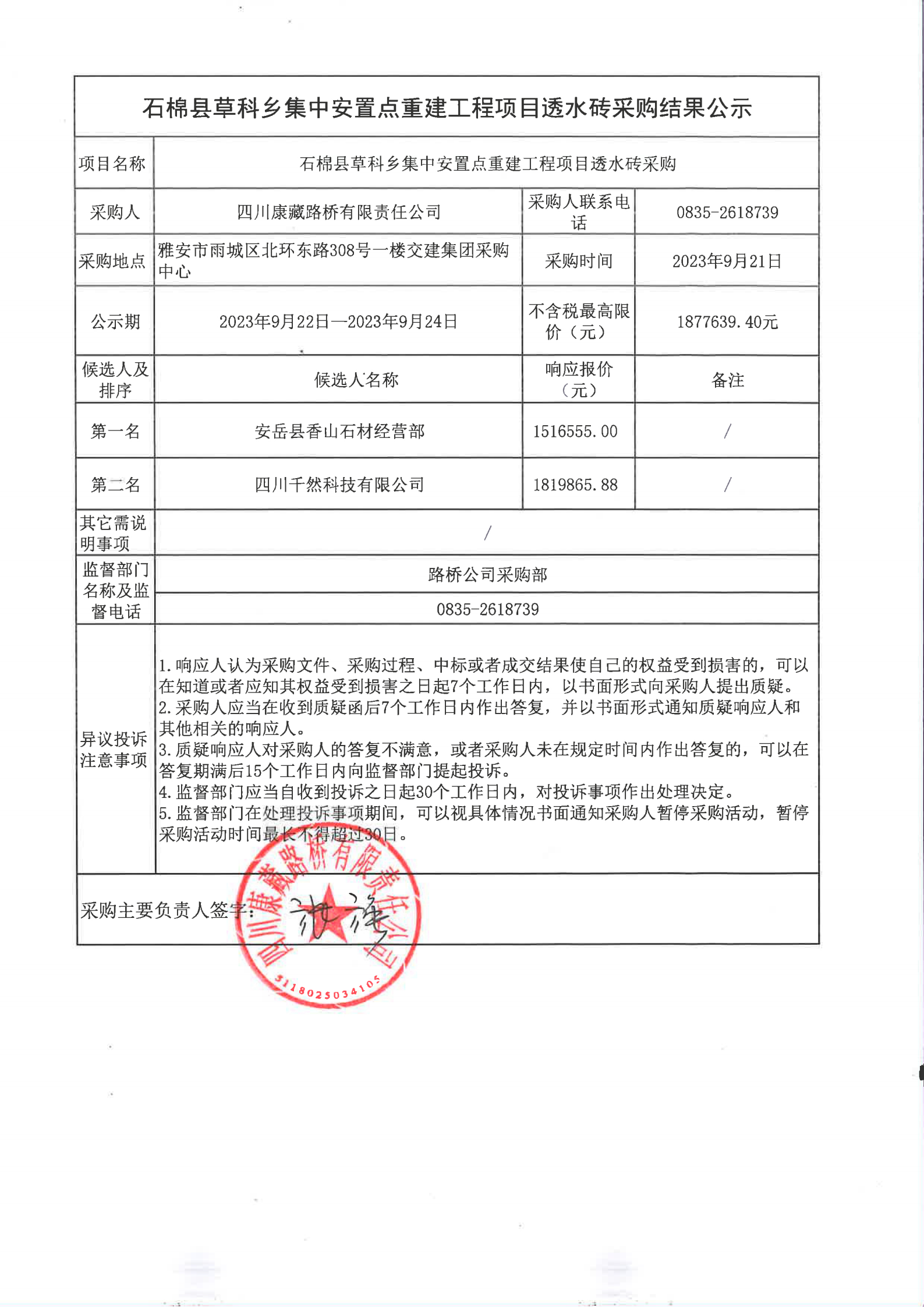 四川康藏路橋有限責(zé)任公司石棉縣草科鄉(xiāng)集中安置點(diǎn)重建工程項(xiàng)目透水磚采購結(jié)果公示