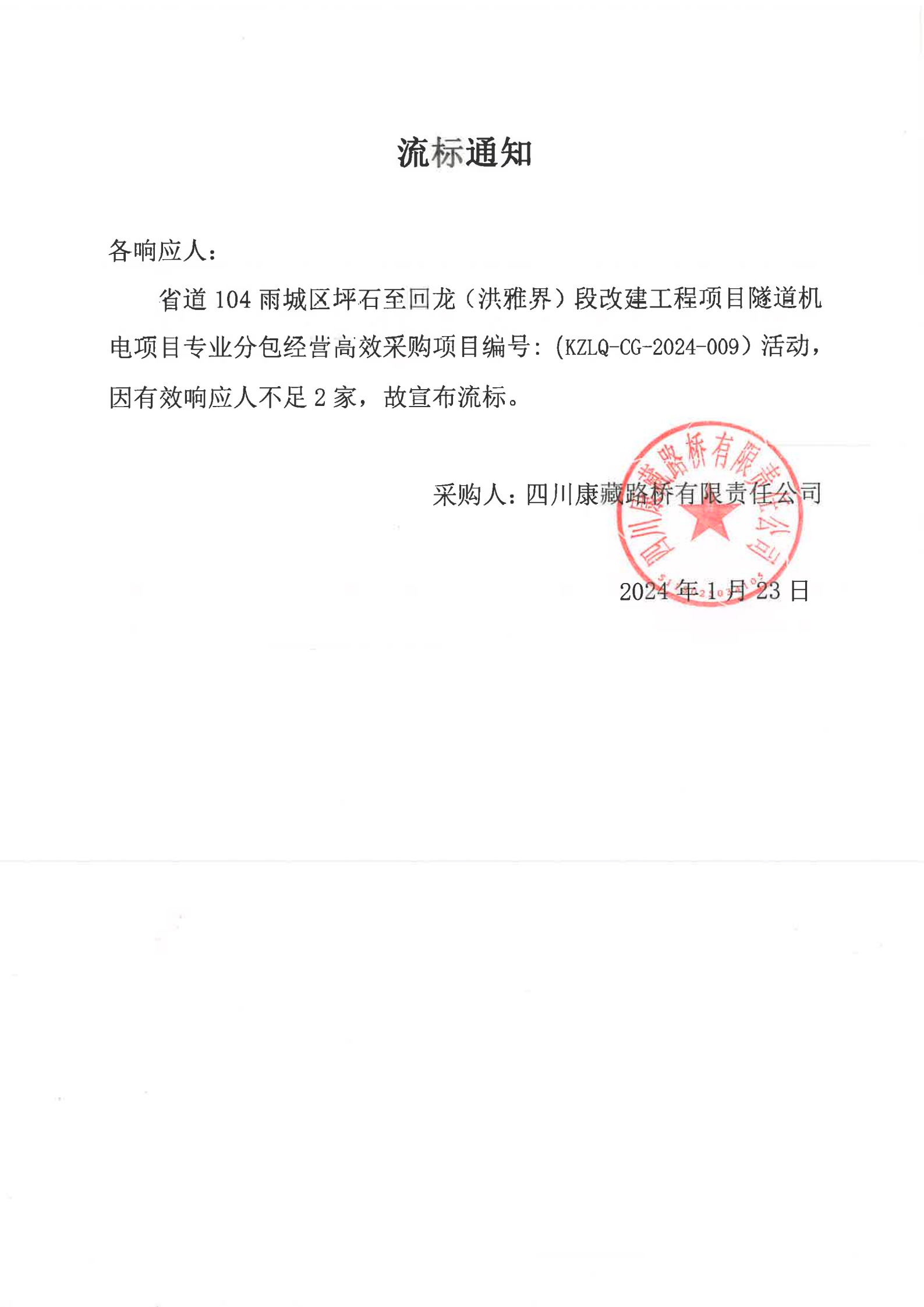 四川康藏路橋有限責任公司省道104雨城區(qū)坪石至回龍(洪雅界)段改建工程項目隧道機電項目專業(yè)分包經(jīng)營高效采購流標通知