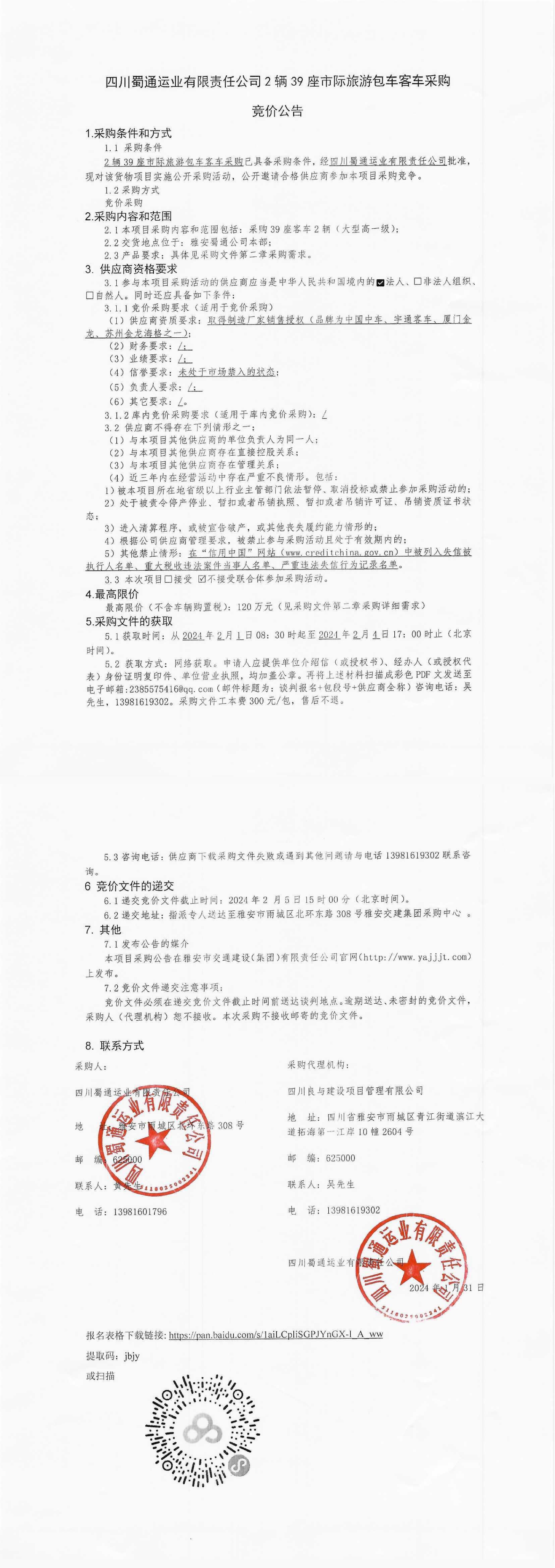 四川蜀通運(yùn)業(yè)有限責(zé)任公司2輛39座市際旅游包車(chē)客車(chē)采購(gòu)競(jìng)價(jià)公告