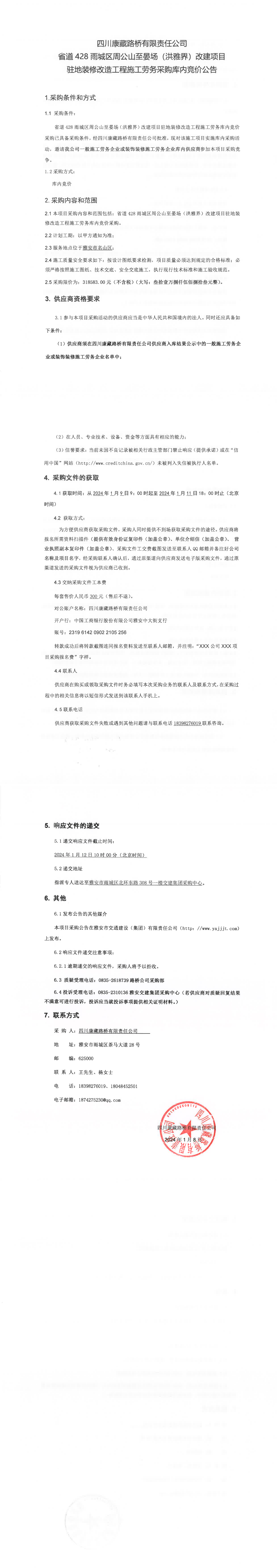 四川康藏路橋有限責(zé)任公司省道428雨城區(qū)周公山至晏場(洪雅界)改建項(xiàng)目駐地裝修改造工程施工勞務(wù)采購庫內(nèi)競價公告