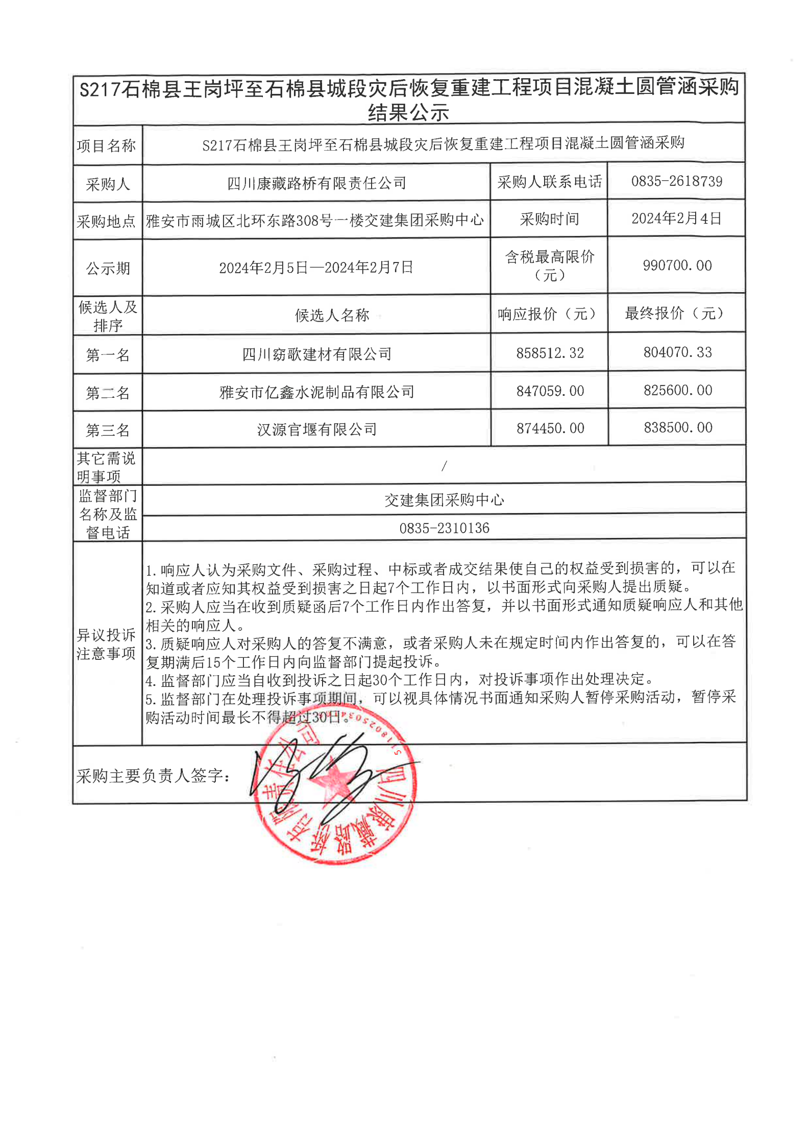 四川康藏路橋有限責(zé)任公司S217石棉縣王崗坪至石棉縣城段災(zāi)后恢復(fù)重建工程項目混凝土圓管涵采購結(jié)果公示