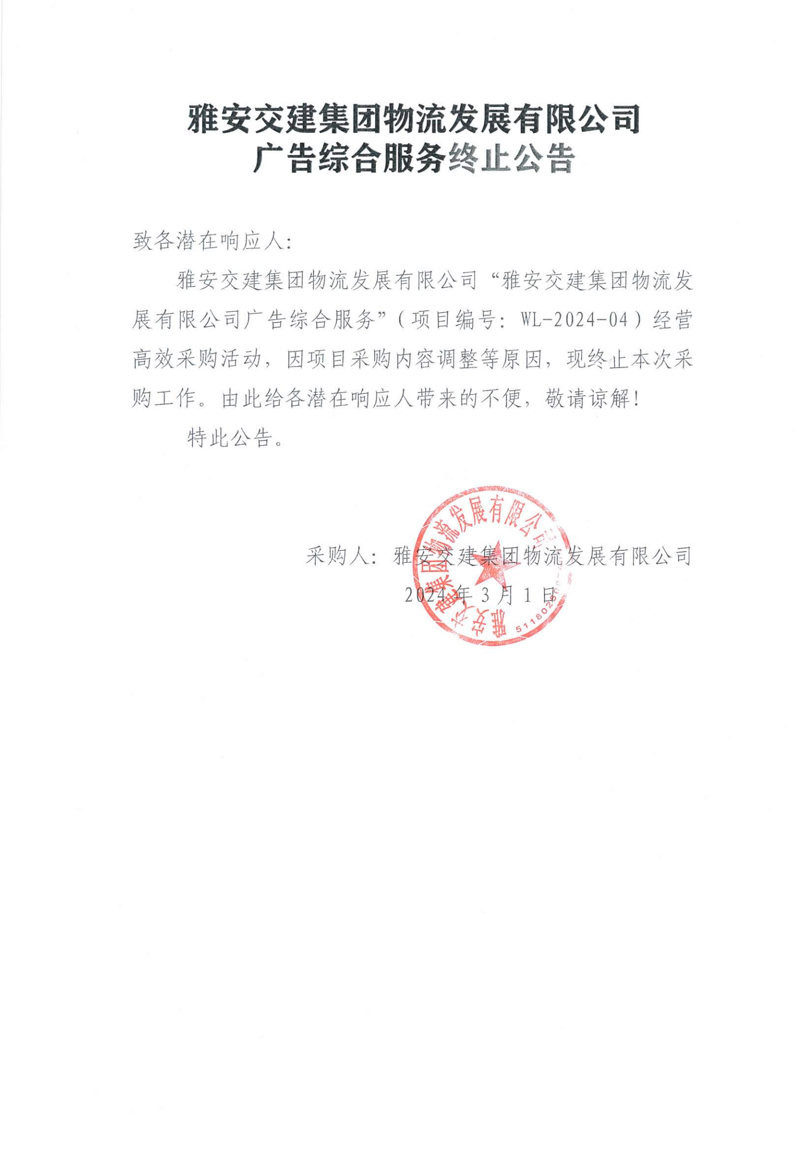 雅安交建集團物流發(fā)展有限公司廣告綜合服務終止公告