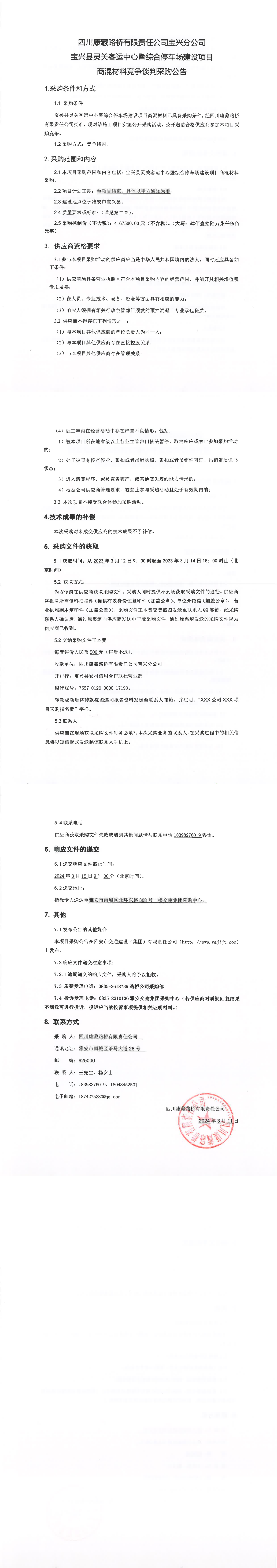 四川康藏路橋有限責(zé)任公司寶興縣靈關(guān)客運中心暨綜合停車場建設(shè)項目商混材料競爭談判采購公告