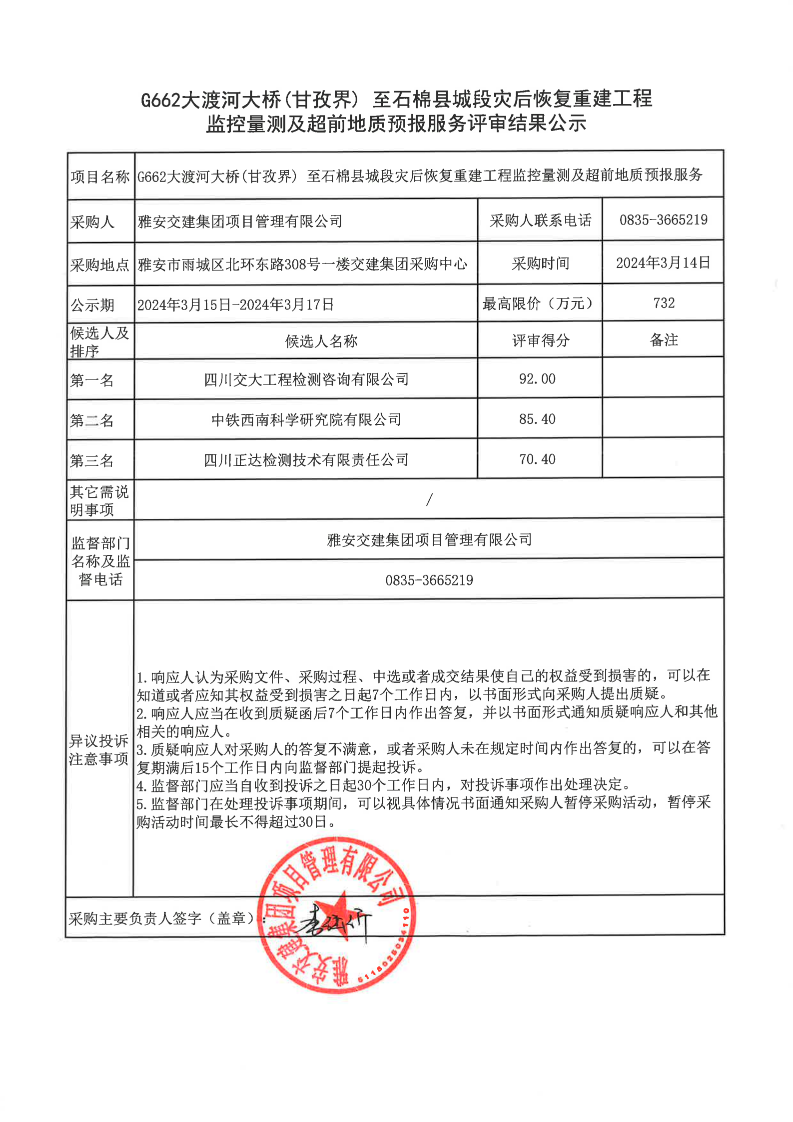 雅安交建集團(tuán)項(xiàng)目管理有限公司G662大渡河大橋(甘孜界)至石棉縣城段災(zāi)后恢復(fù)重建工程監(jiān)控量測及超前地質(zhì)預(yù)報服務(wù)評審結(jié)果公示