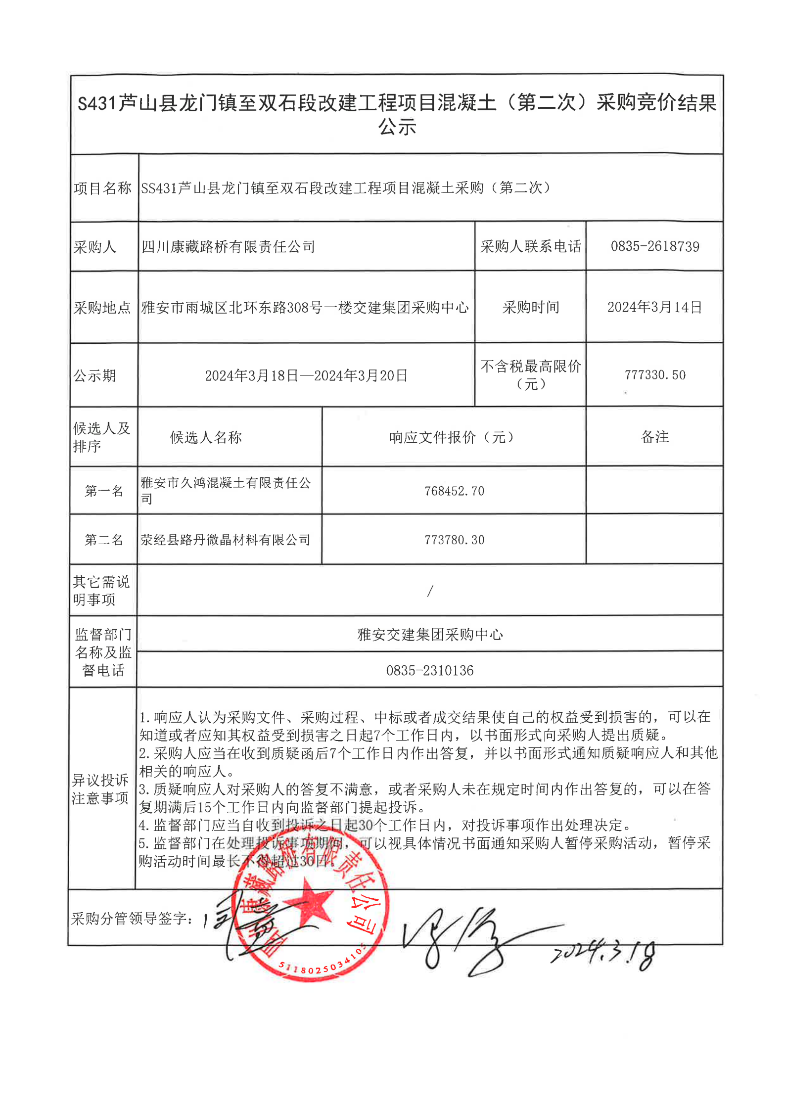 四川康藏路橋有限責(zé)任公司S431蘆山縣龍門(mén)鎮(zhèn)至雙石段改建工程項(xiàng)目混凝土(第二次)采購(gòu)競(jìng)價(jià)結(jié)果公示