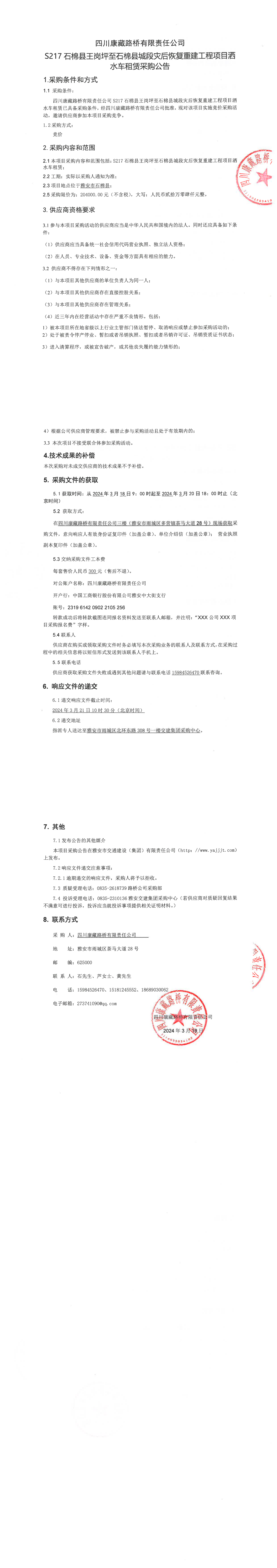 四川康藏路橋有限責(zé)任公司S217石棉縣王崗坪至石棉縣城段災(zāi)后恢復(fù)重建工程項(xiàng)目灑水車租賃采購公告