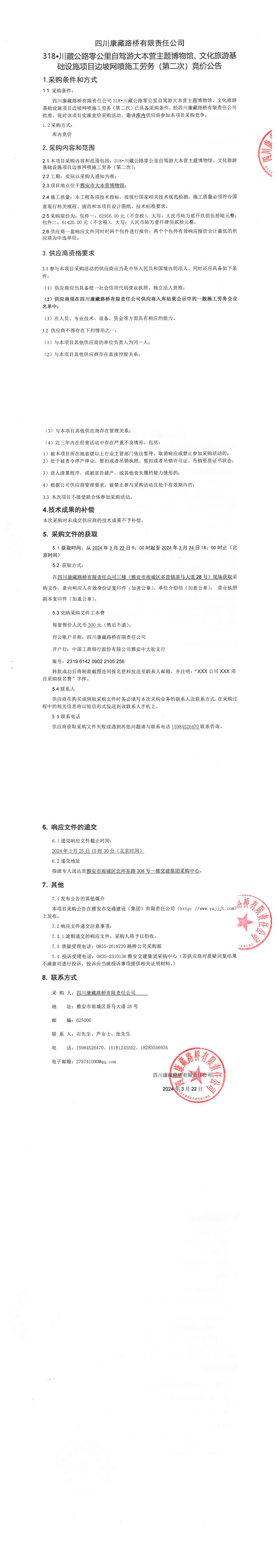 四川康藏路橋有限責任公司318·川藏公路零公里自駕游大本營主題博物館、文化旅游基礎設施項目邊坡網(wǎng)噴施工勞務(第二次)競價公告