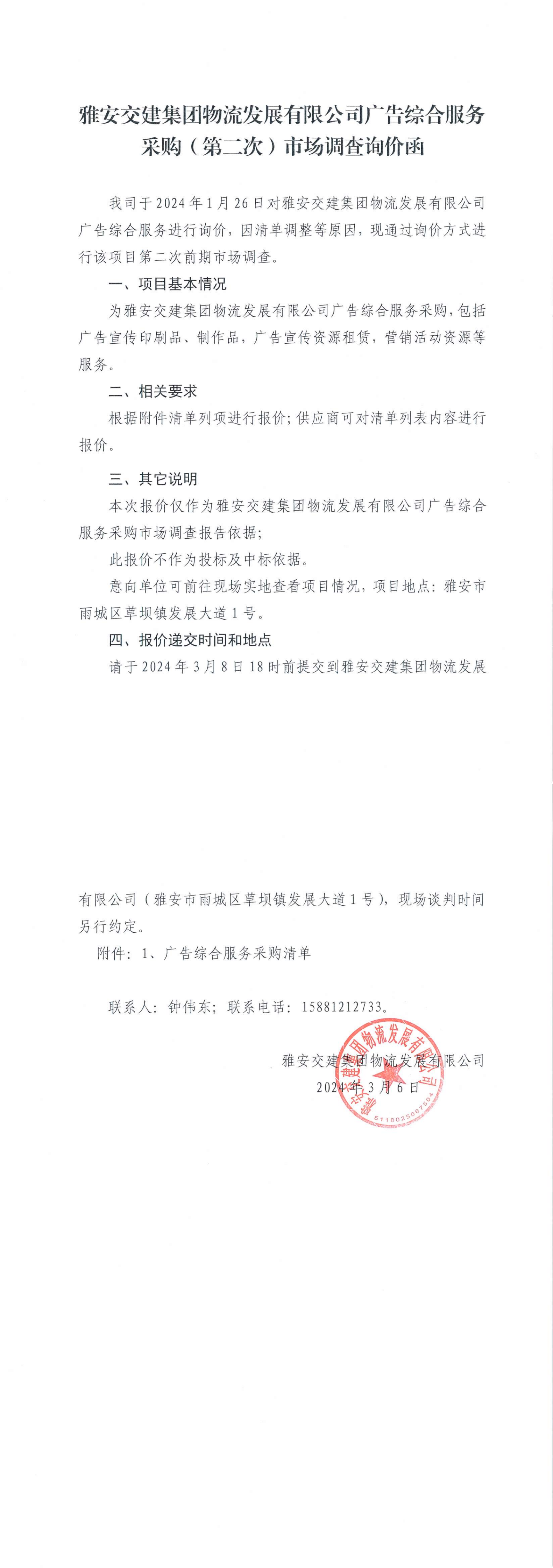 雅安交建集團(tuán)物流發(fā)展有限公司廣告綜合服務(wù)采購(第二次)市場(chǎng)調(diào)查詢價(jià)函