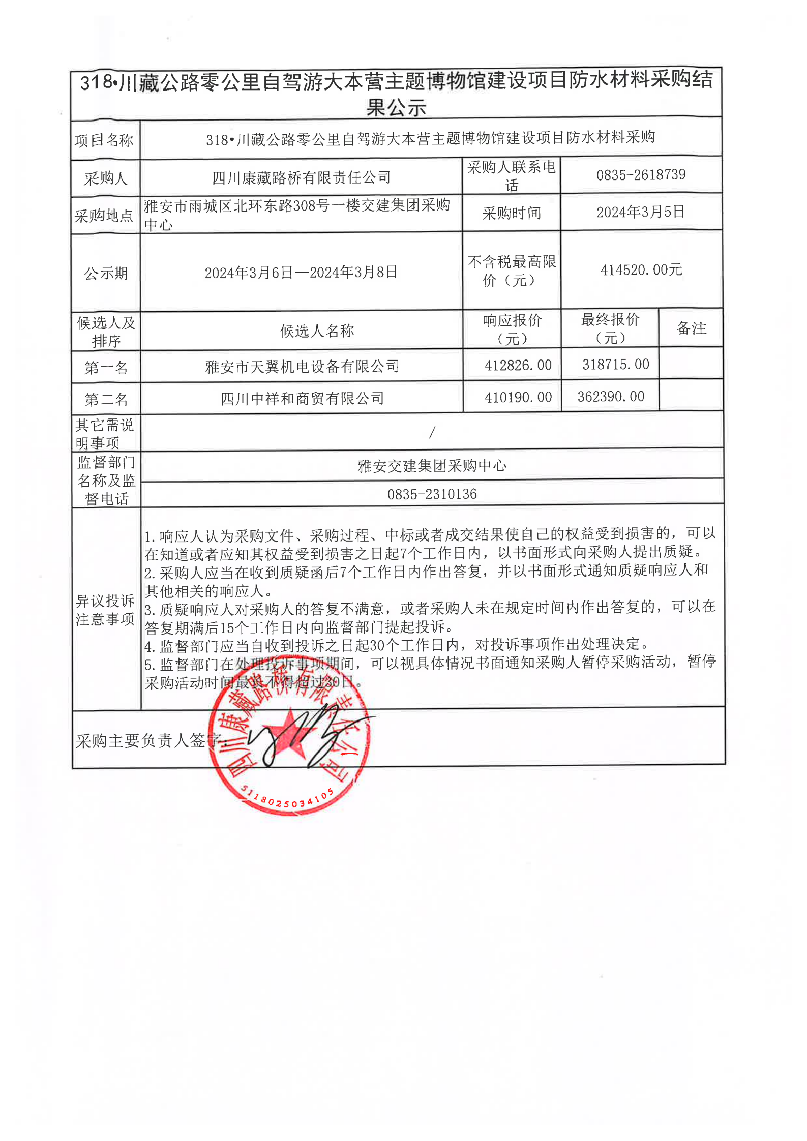 四川康藏路橋有限責任公司318·川藏公路零公里自駕游大本營主題博物館建設項目防水材料采購結果公示