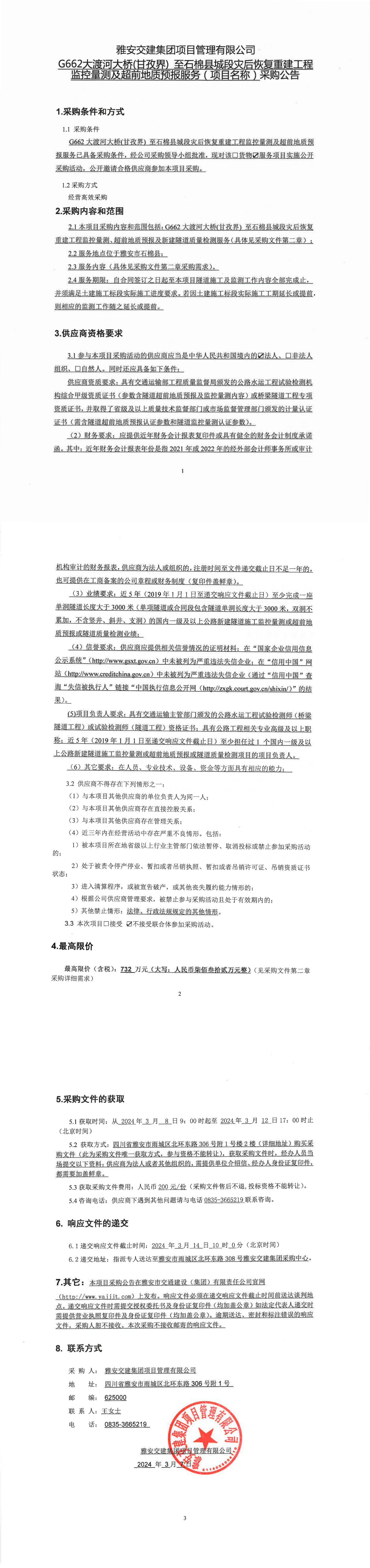 雅安交建集團(tuán)項目管理有限公司G662大渡河大橋(甘孜界)至石棉縣城段災(zāi)后恢復(fù)重建工程監(jiān)控量測及超前地質(zhì)預(yù)報服務(wù)(項目名稱)采購公告