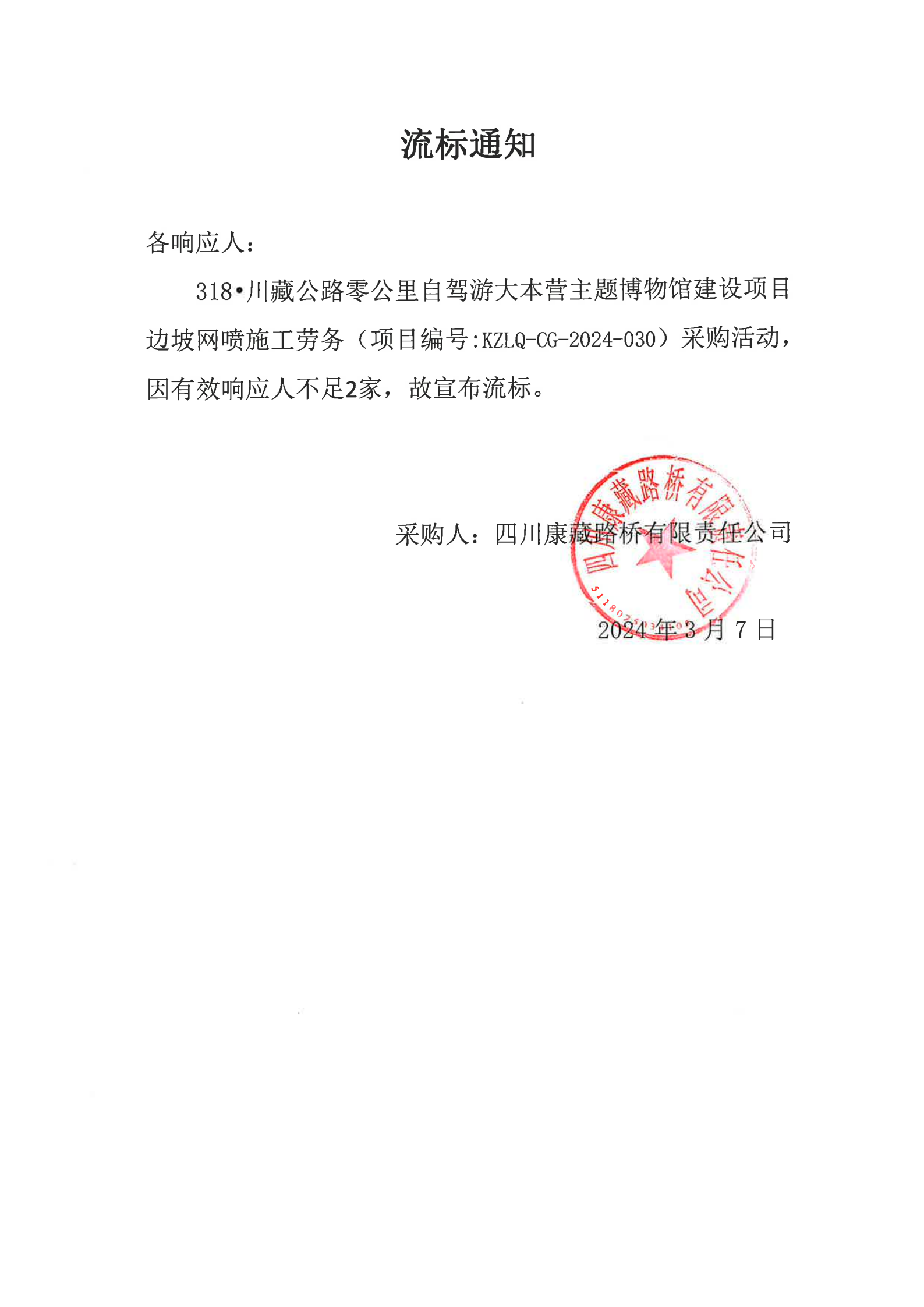 四川康藏路橋有限責(zé)任公司318·川藏公路零公里自駕游大本營(yíng)主題博物館建設(shè)項(xiàng)目邊坡網(wǎng)噴施工勞務(wù)流標(biāo)通知