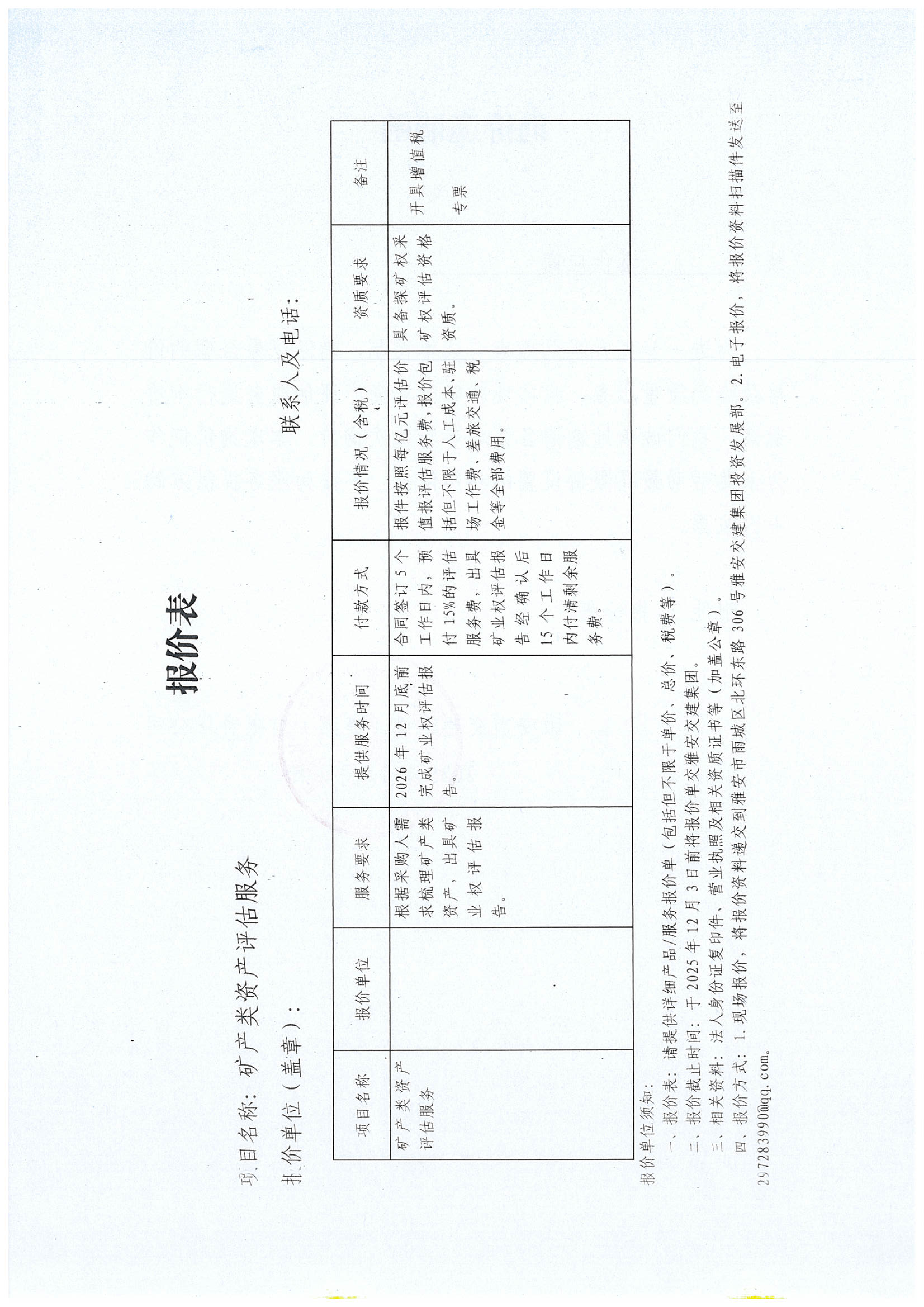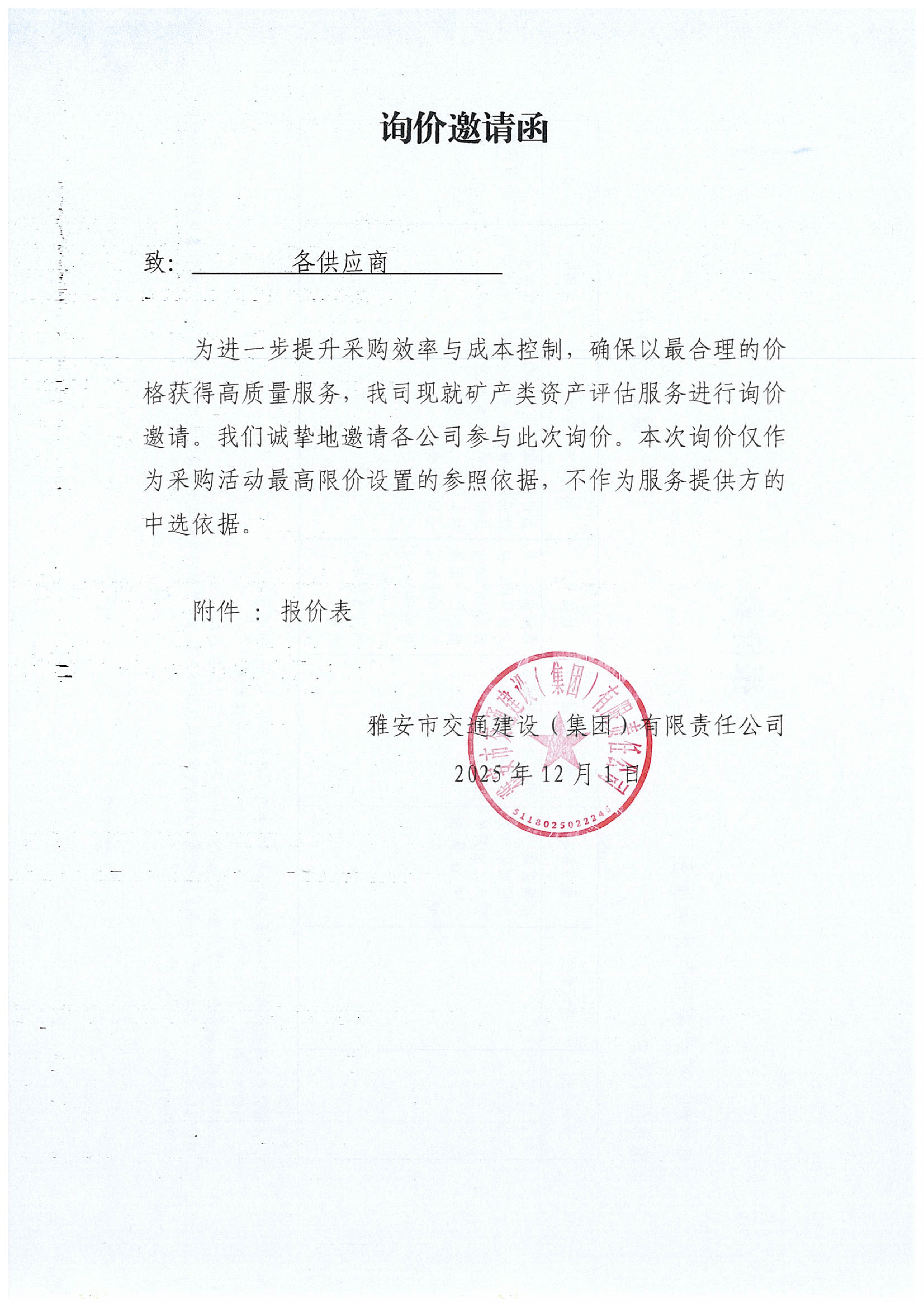 關(guān)于雅安市交通建設(shè)(集團(tuán))有限責(zé)任公司礦產(chǎn)類資產(chǎn)評估服務(wù)采購限價(jià)的詢價(jià)函