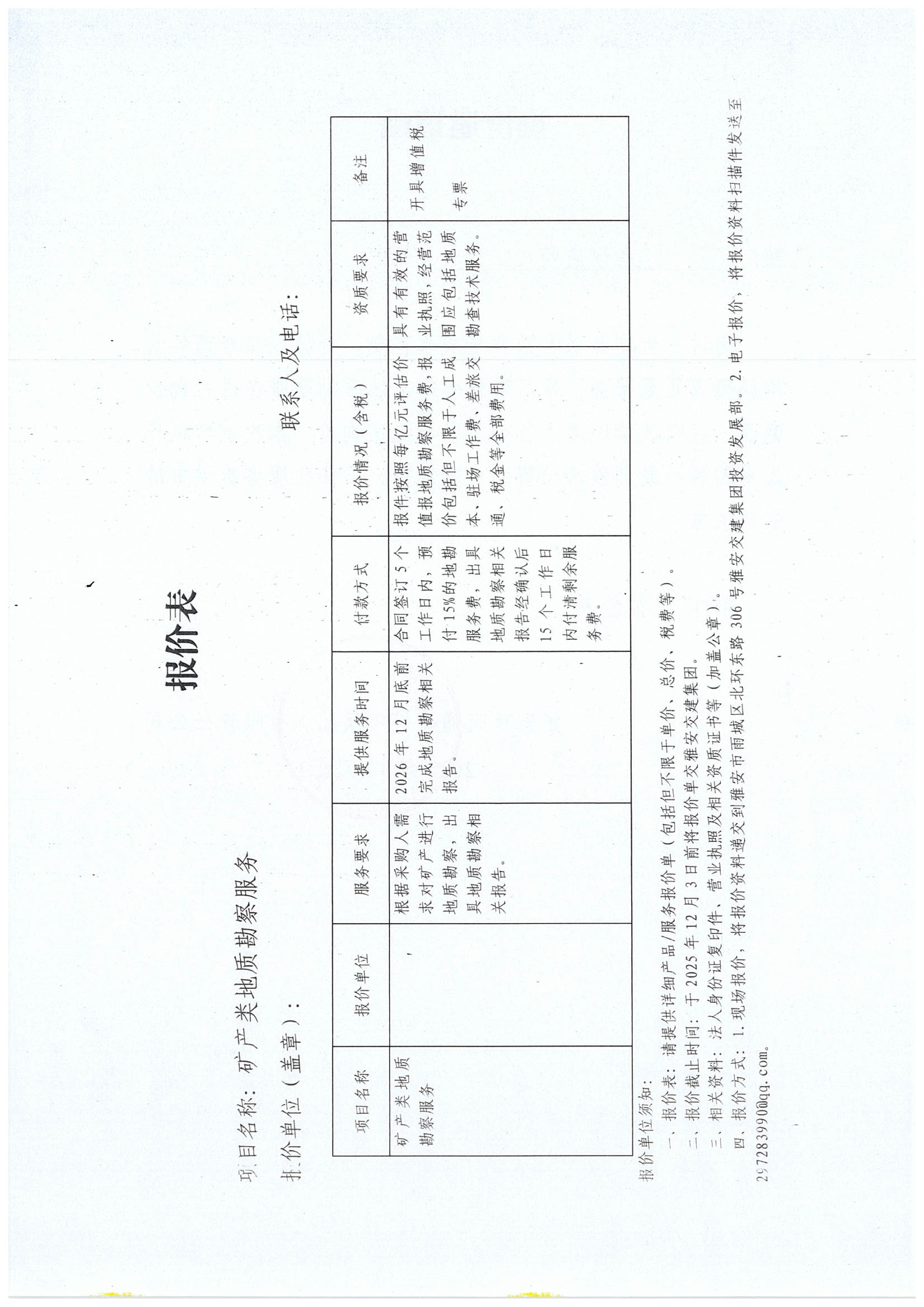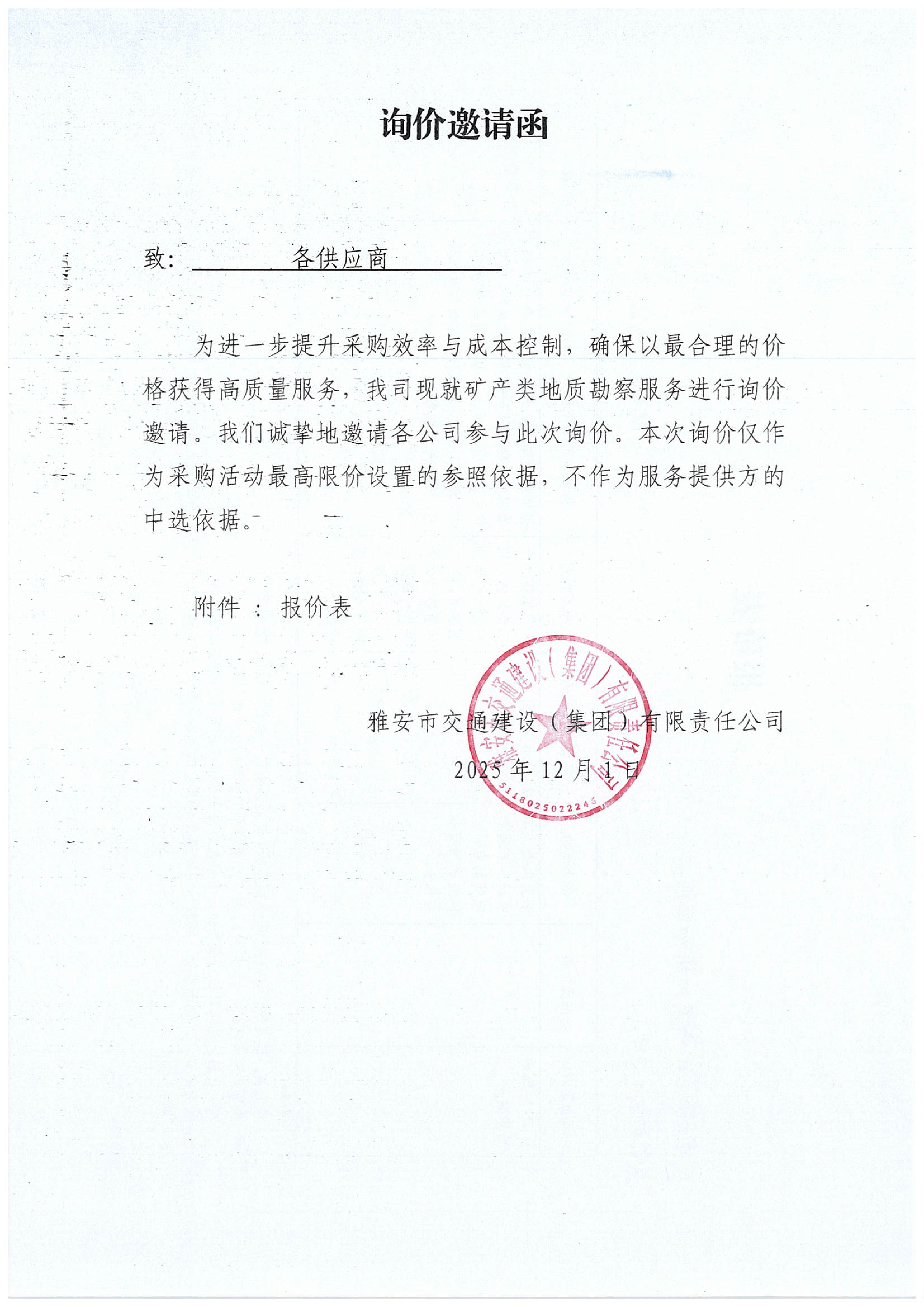 關(guān)于雅安市交通建設(shè)(集團(tuán))有限責(zé)任公司礦產(chǎn)類(lèi)地質(zhì)勘察服務(wù)限價(jià)的詢(xún)價(jià)函