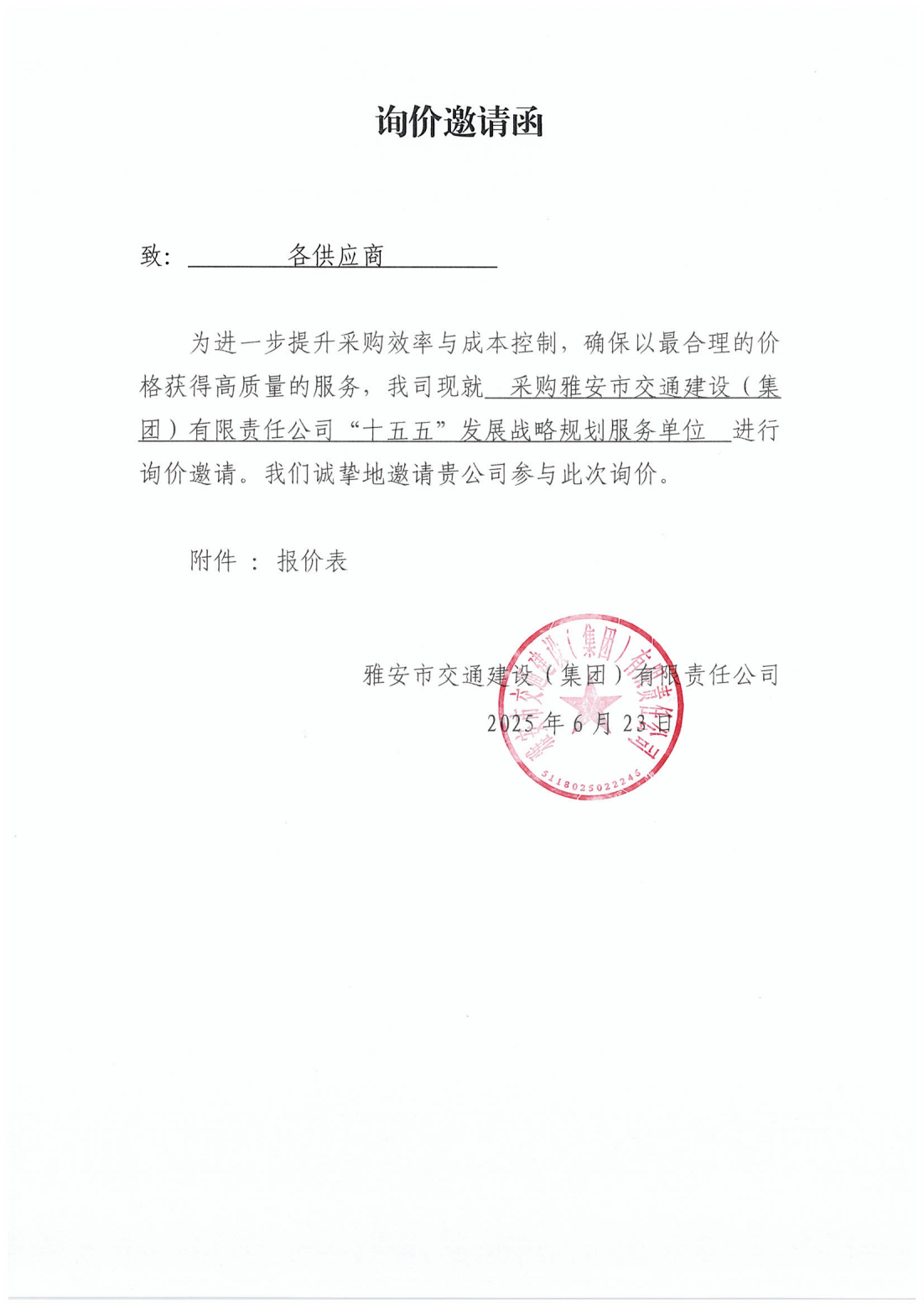 關(guān)于采購雅安市交通建設(shè)(集團(tuán))有限責(zé)任公司“十五五”發(fā)展戰(zhàn)略規(guī)劃服務(wù)單位的詢價