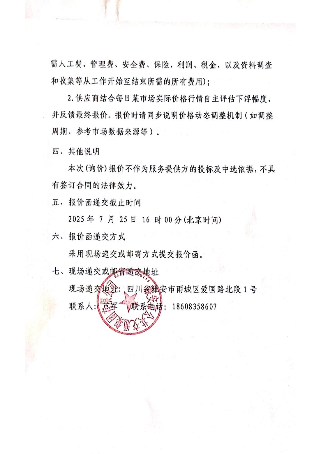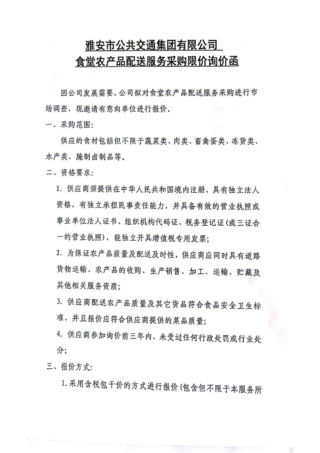 關于雅安市公共交通集團有限公司食堂農(nóng)產(chǎn)品配送服務采購限價的詢價函
