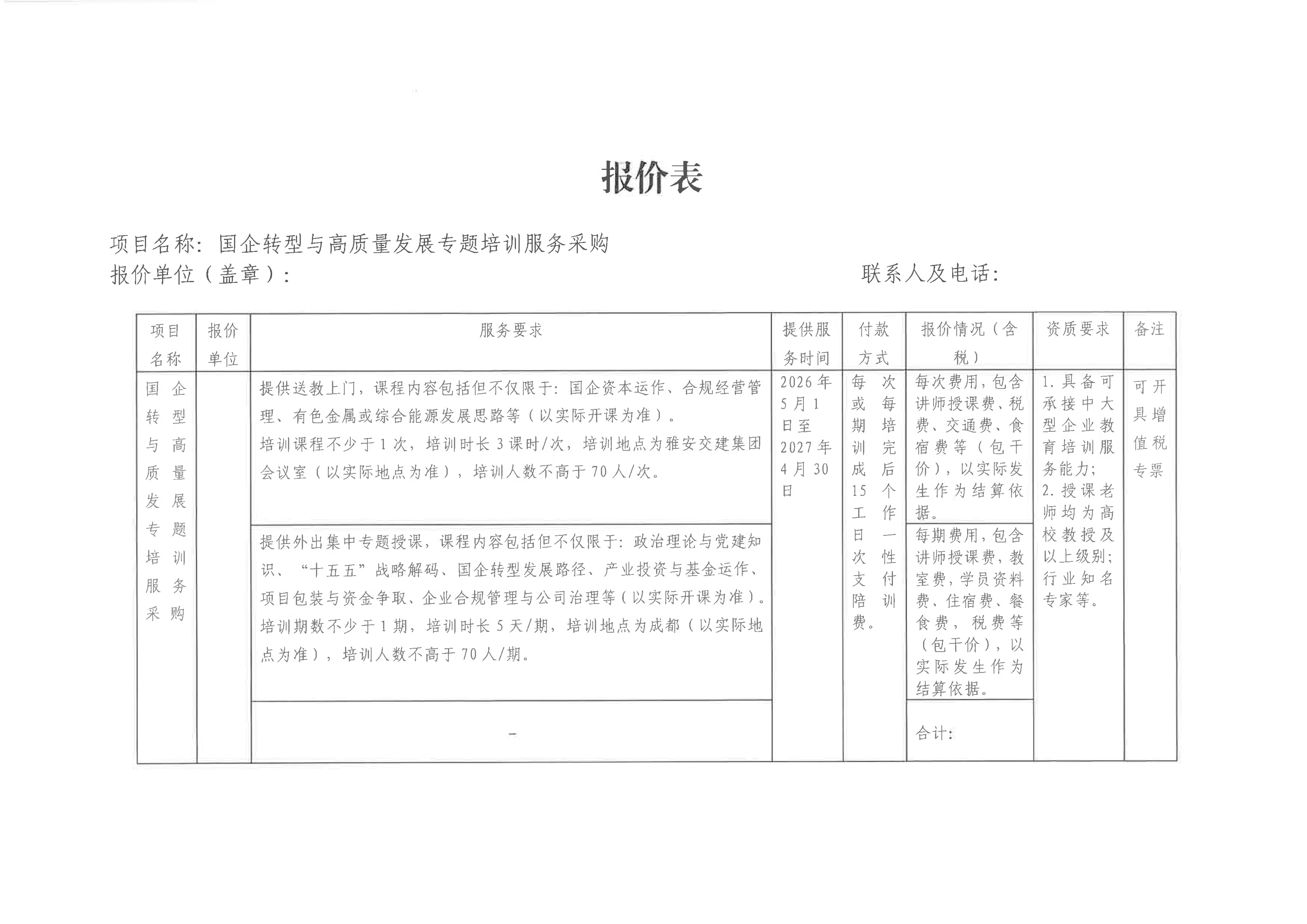 關(guān)于雅安市交通建設(shè)(集團(tuán))有限責(zé)任公司國(guó)企轉(zhuǎn)型與高質(zhì)量發(fā)展專題培訓(xùn)服務(wù)采購(gòu)限價(jià)的詢價(jià)函