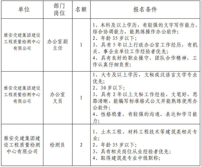 根據(jù)發(fā)展需要,決定面向社會(huì)公開(kāi)招聘雅安市交通建設(shè)(集團(tuán))有限責(zé)任公司(以下簡(jiǎn)稱“雅安交建集團(tuán)”)所屬子公司工作人員4名,現(xiàn)將有關(guān)事項(xiàng)公告如下: