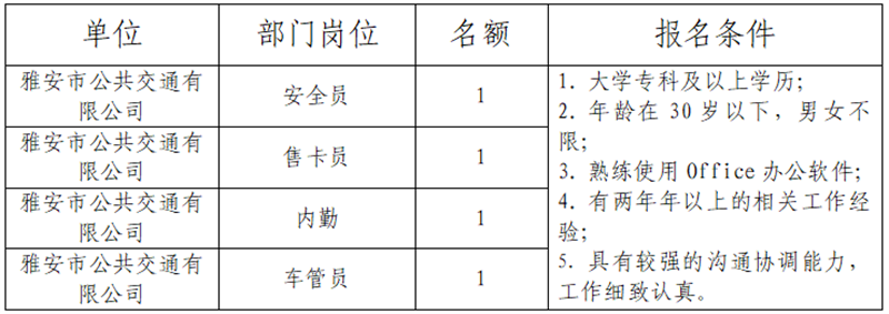 1、報名。公告發(fā)布在雅安市交通建設(集團)有限責任公司門戶網(wǎng)站,自發(fā)布之日起,即可報名。截止時間為2019年6月8日。網(wǎng)上報名,報名者須如實填寫《報名登記表》。在規(guī)定時間內(nèi)將填寫好的《報名登記表》、本人有效身份證、畢業(yè)證、職稱、執(zhí)業(yè)資格及工作業(yè)績等證明材料以電子文檔的形式發(fā)送至郵箱104515026@qq.com(姓名+應聘公司名稱+應聘工作崗位)。咨詢電話15908143154。