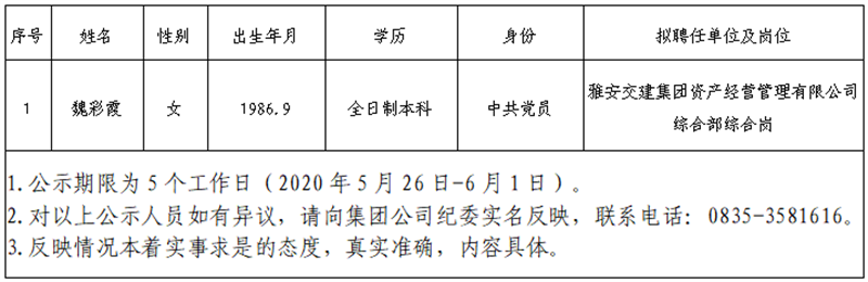 雅安交建集團(tuán)擬聘用所屬子公司工作人員公示 (資產(chǎn)公司)