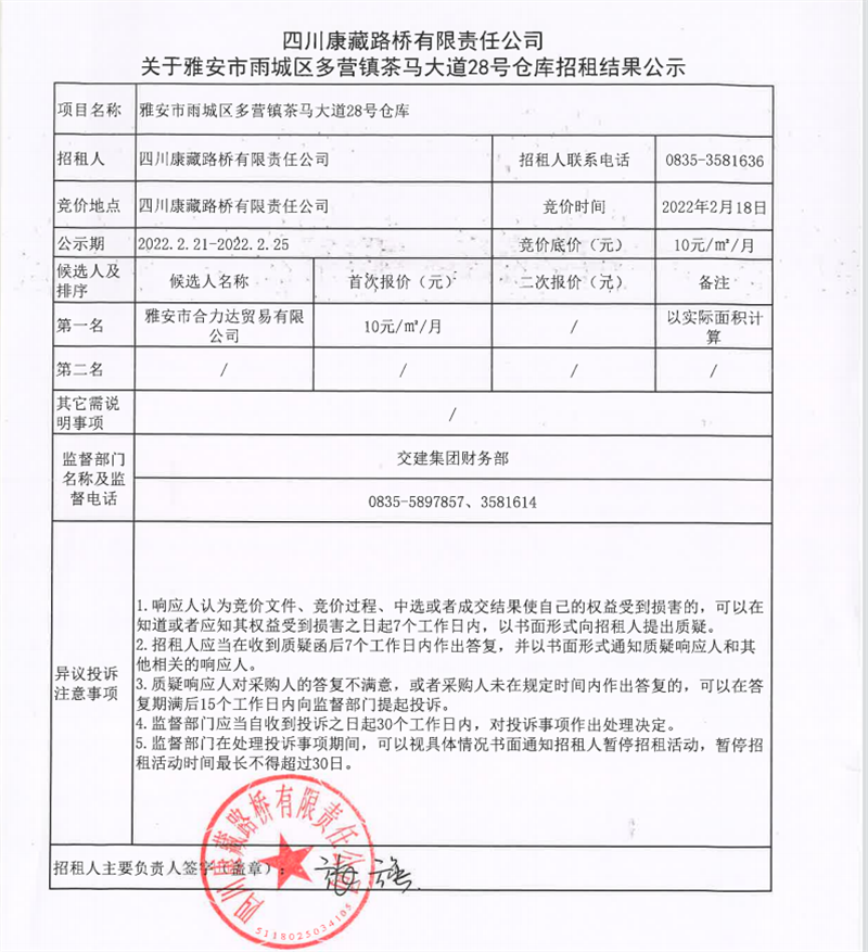 四川康藏路橋有限責任公司關于雅安市雨城區(qū)多營鎮(zhèn)茶馬大道28號倉庫招租結果的公示