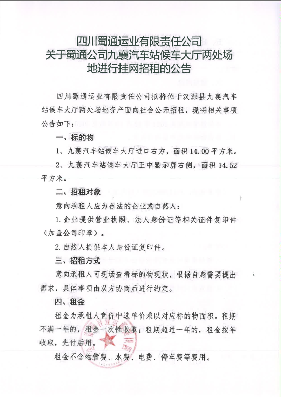 四川蜀通運業(yè)郵箱責(zé)任公司關(guān)于蜀通公司九襄汽車站候車大廳兩處場地進行掛網(wǎng)招租的公告附件