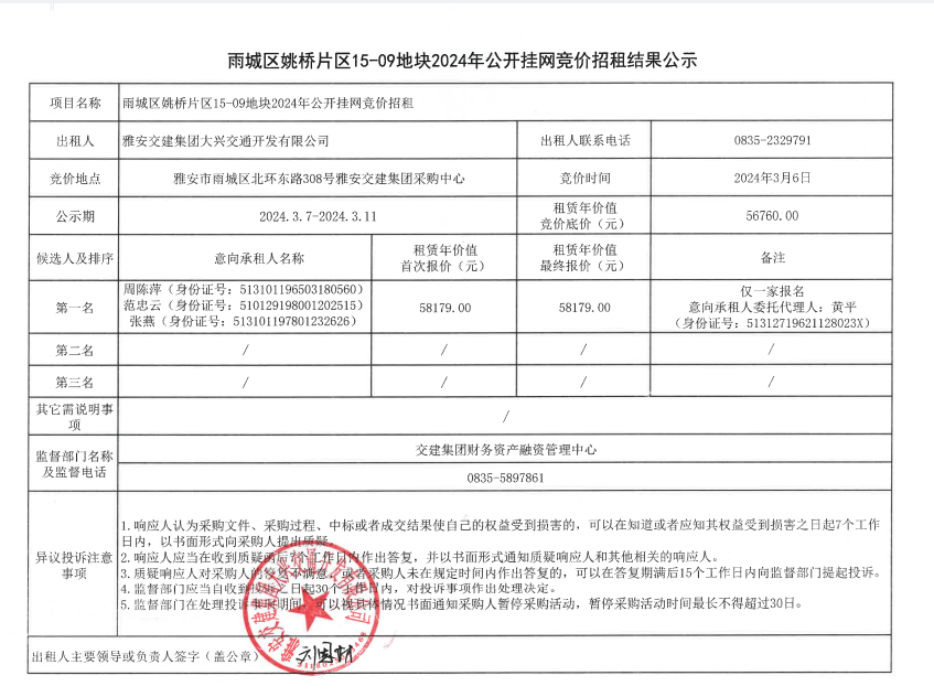 雨城區(qū)姚橋片區(qū)15-09競價招租結(jié)果公示