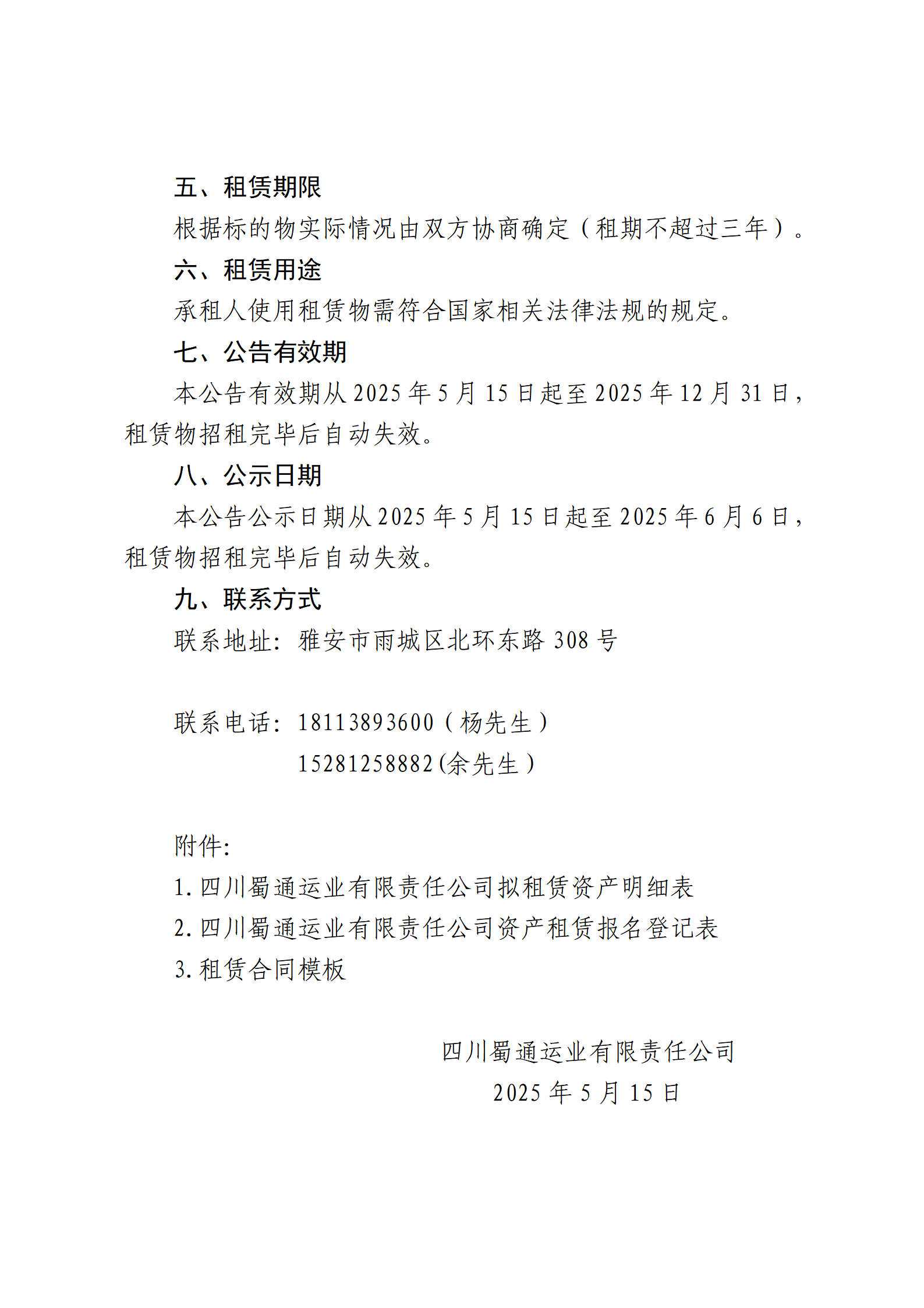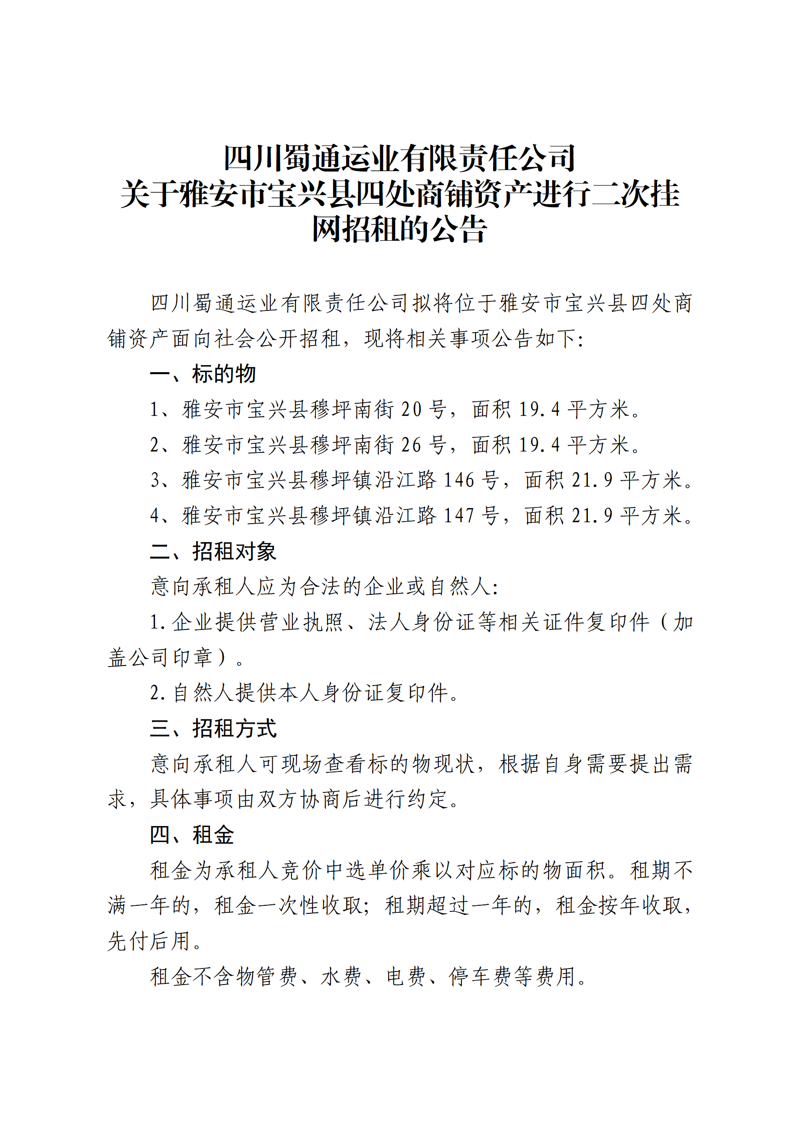 四川蜀通運業(yè)有限責任公司 關(guān)于雅安市寶興縣四處商鋪資產(chǎn)進行二次掛網(wǎng)招租的公告