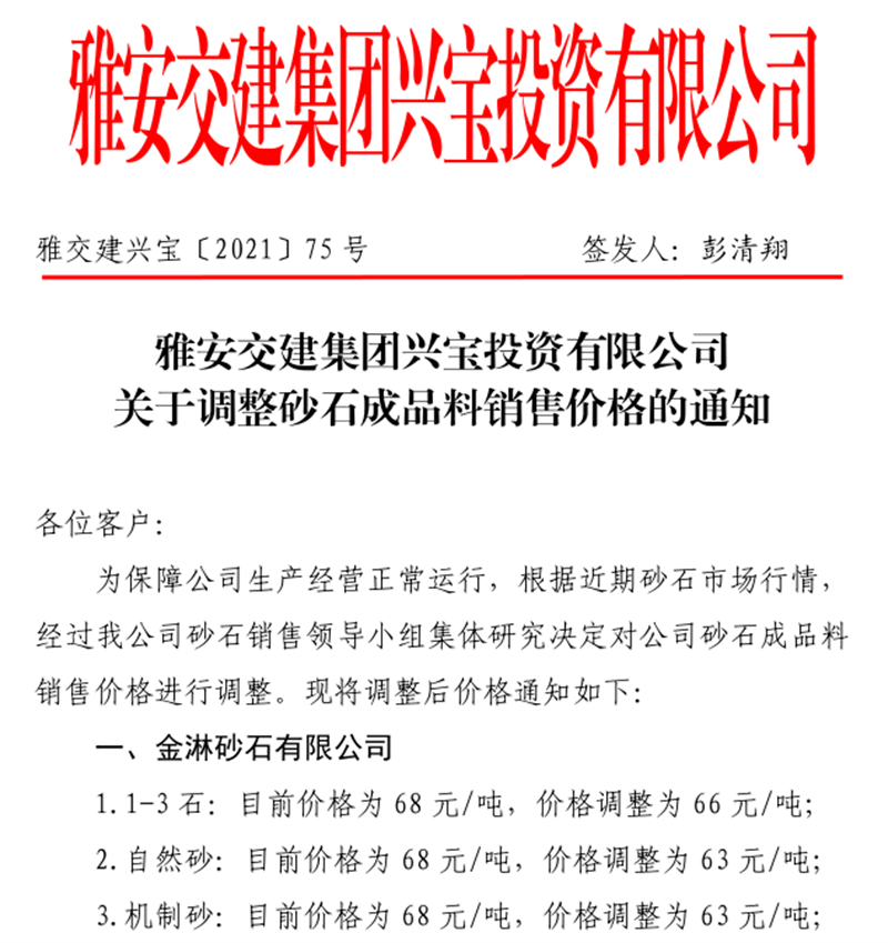 雅安交建集團(tuán)云石公司關(guān)于調(diào)整成品料銷售價(jià)格的通知(2021.11.4)