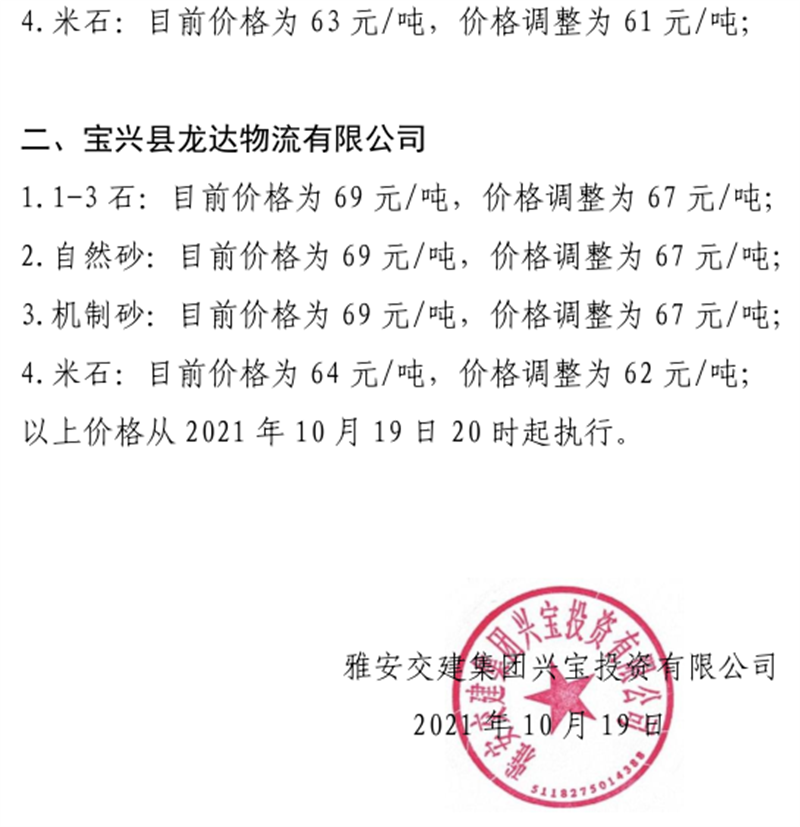 雅安交建集團(tuán)興寶公司關(guān)于調(diào)整成品料銷售價(jià)格的通知(2021.10.20)