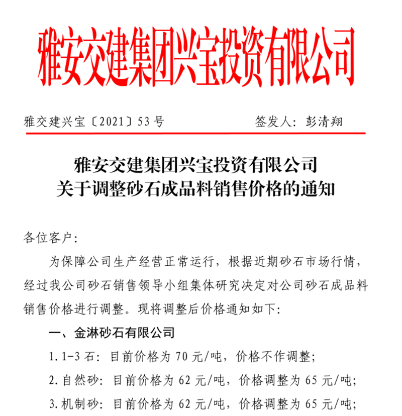 雅安交建集團丹石公司關于調(diào)整風化石灰?guī)r礦石料銷售價格的通知