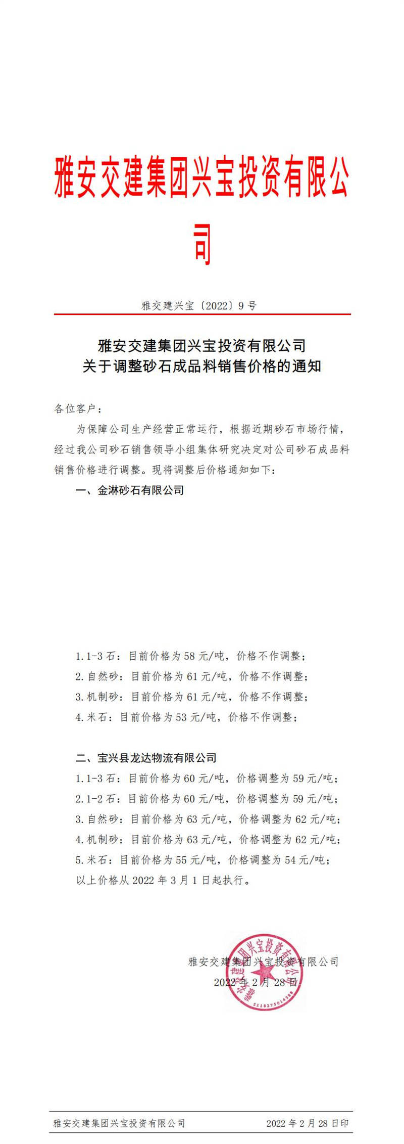 ÑŰ²½»½¨¼¯ˆF(tu¨¢n)ÅdŒšÍ¶ÙYÓÐÏÞ¹«Ë¾ êP(gu¨¡n)ÓÚÕ{(di¨¤o)Õûɰʯ³ÉÆ·ÁÏäNÊÛƒr¸ñµÄ֪ͨ£¨2022-2-23£©