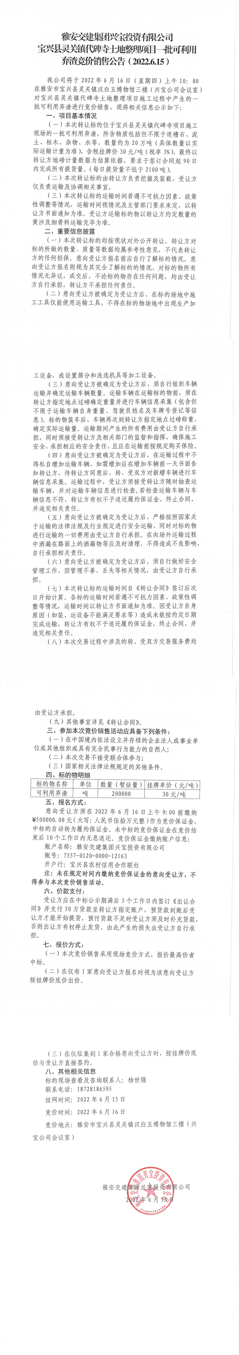 雅安交建集團(tuán)興寶投資有限公司寶興縣靈關(guān)鎮(zhèn)代碑寺土地整理項(xiàng)目-批可利用 棄渣競(jìng)價(jià)銷(xiāo)售公告( 2022.6.15 )