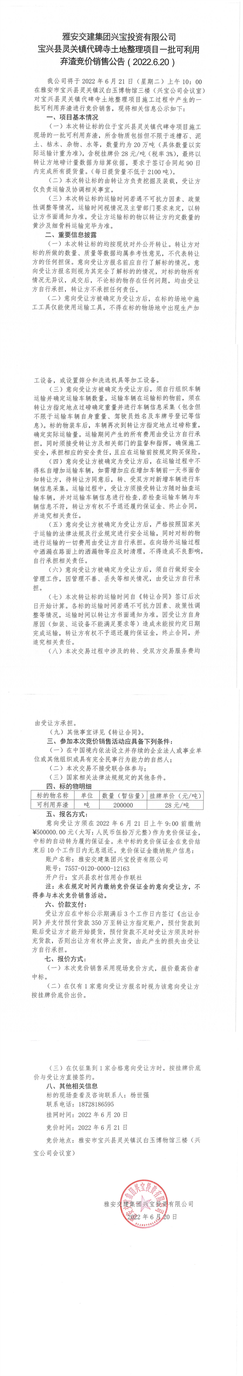 雅安交建集團(tuán)興寶投資有限公司寶興縣靈關(guān)鎮(zhèn)代碑寺土地整理項(xiàng)目-批可利用 棄渣競(jìng)價(jià)銷售公告( 2022.6.21)