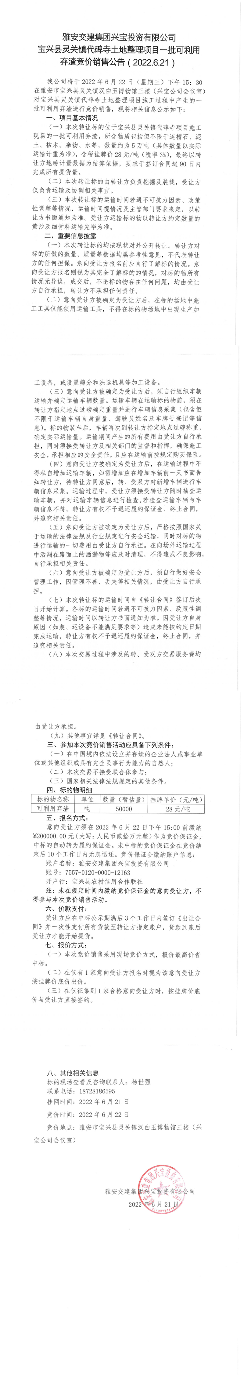 雅安交建集團(tuán)興寶投資有限公司寶興縣靈關(guān)鎮(zhèn)代碑寺土地整理項(xiàng)目-批可利用 棄渣競(jìng)價(jià)銷售公告( 2022.6.21)