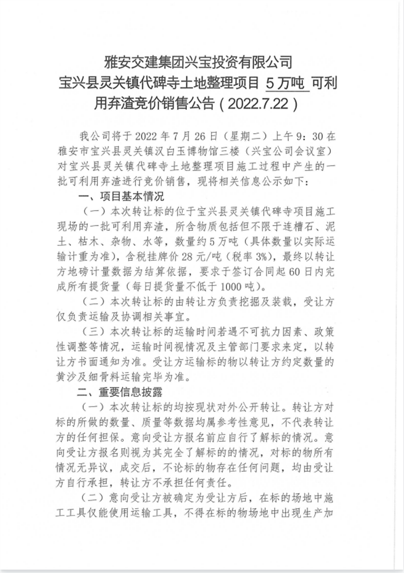 興寶公司寶興縣靈關(guān)鎮(zhèn)代碑寺土地整理項目10萬噸可利用棄渣競價銷售掛網(wǎng)公告掛網(wǎng)公告7.22(5萬噸)