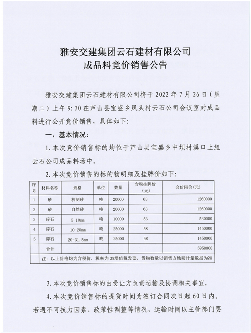 雅安交建集團(tuán)云石建材有限公司成品料競價(jià)銷售公告