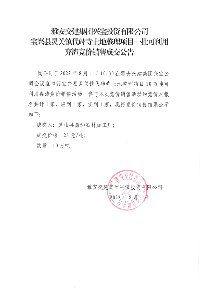 雅安交建集團(tuán)興寶投資有限公司靈關(guān)鎮(zhèn)代碑寺土地整理項(xiàng)目5萬噸可利用棄渣競價(jià)銷售成交公告(2022.8.1)
