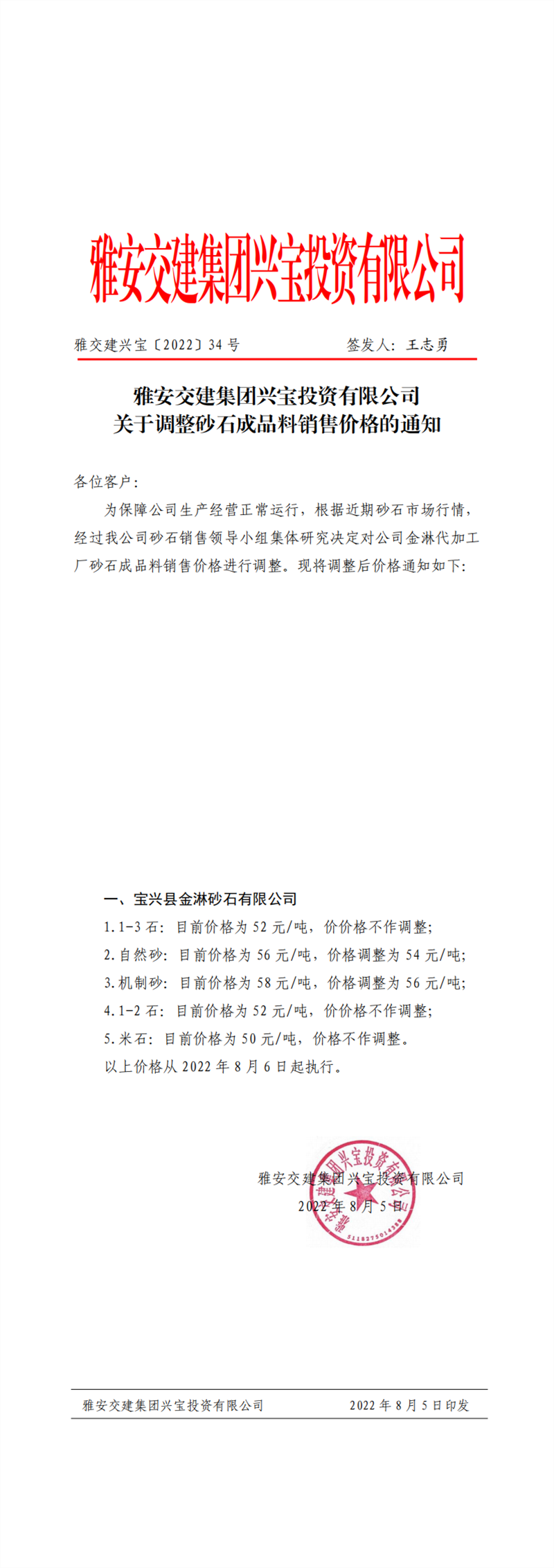 雅交建興寶〔2022〕34號 關(guān)于調(diào)整砂石成品料銷售價(jià)格的通知