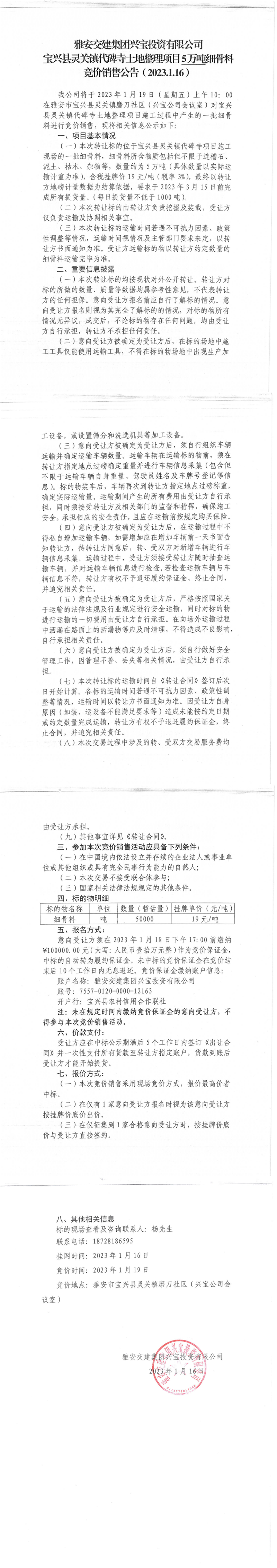 雅安交建集團(tuán)興寶投資有限公司寶興縣靈關(guān)鎮(zhèn)代碑寺土地整理項(xiàng)目5萬(wàn)噸細(xì)骨料競(jìng)價(jià)銷售公告(2023.01.16)